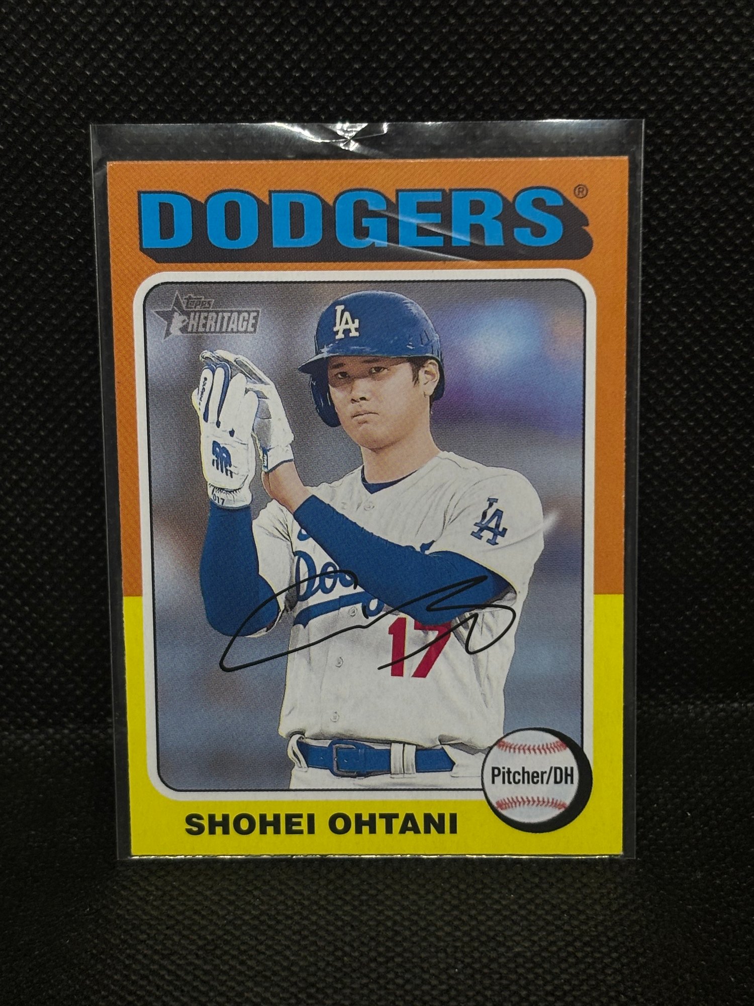 The two-way superstar in his first Dodgers uniform gets the vintage treatment in this 1975 Topps Heritage design. Ohtani’s clean pose, bright retro border, and bold team name make this one of the headline cards of the 2024 Heritage set.