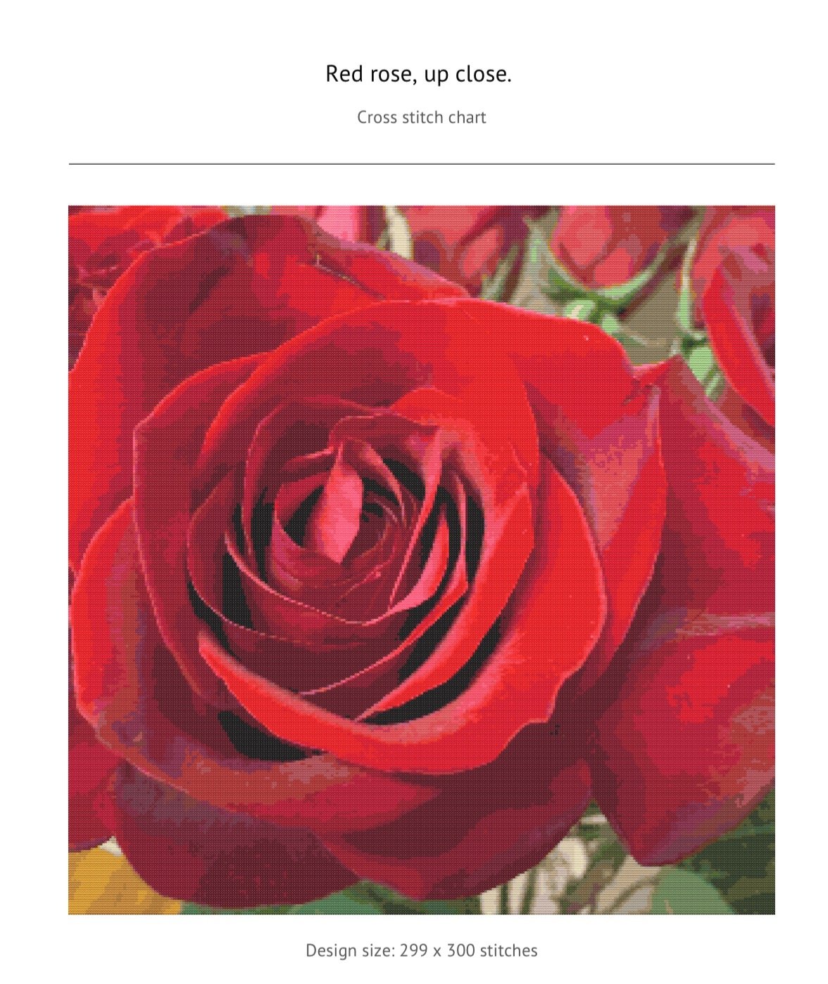 This striking cross stitch pattern captures the timeless beauty of a red rose in vivid, up-close detail. Rich shades of crimson and deep shadowing bring each velvety petal to life, creating a bold and romantic floral design that truly stands out.