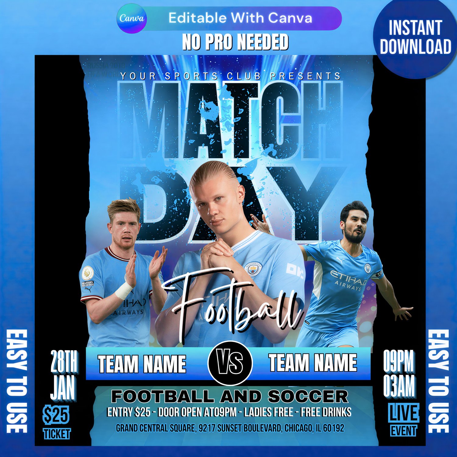 Bring the excitement of game day to life with this bold and dynamic Matchday Football Template, perfect for promoting upcoming matches, tournaments, or team announcements. Designed with a strong sporty aesthetic, this template helps football clubs, schools, and sports communities create eye-catching matchday graphics in minutes—using only Canva and zero design experience.