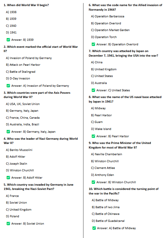 100 World War 2 General Knowledge Quiz Questions and Answers PDF