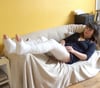 Mélanie is in 2 llc. Laying on a couch, she explains how she brock both her legs. Than she transfer in her wheelchair to roll in the flat. She's so sexy and beautiful in this wheelchair with her two long leg cast. Lot of close up, fun and struggles.