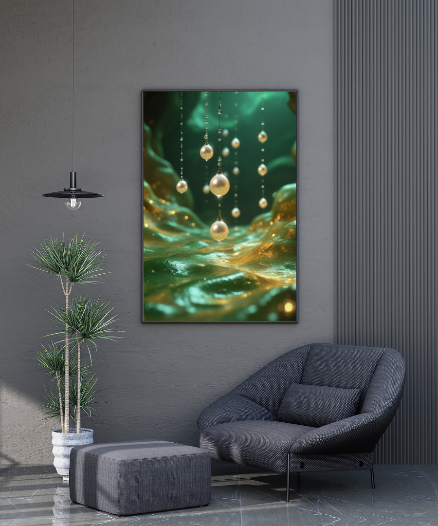 "Golden Elegance" is an abstract art print that combines modern aesthetics with traditional luxury. It features vibrant green hues and shimmering gold tones, creating a dynamic and captivating visual experience.