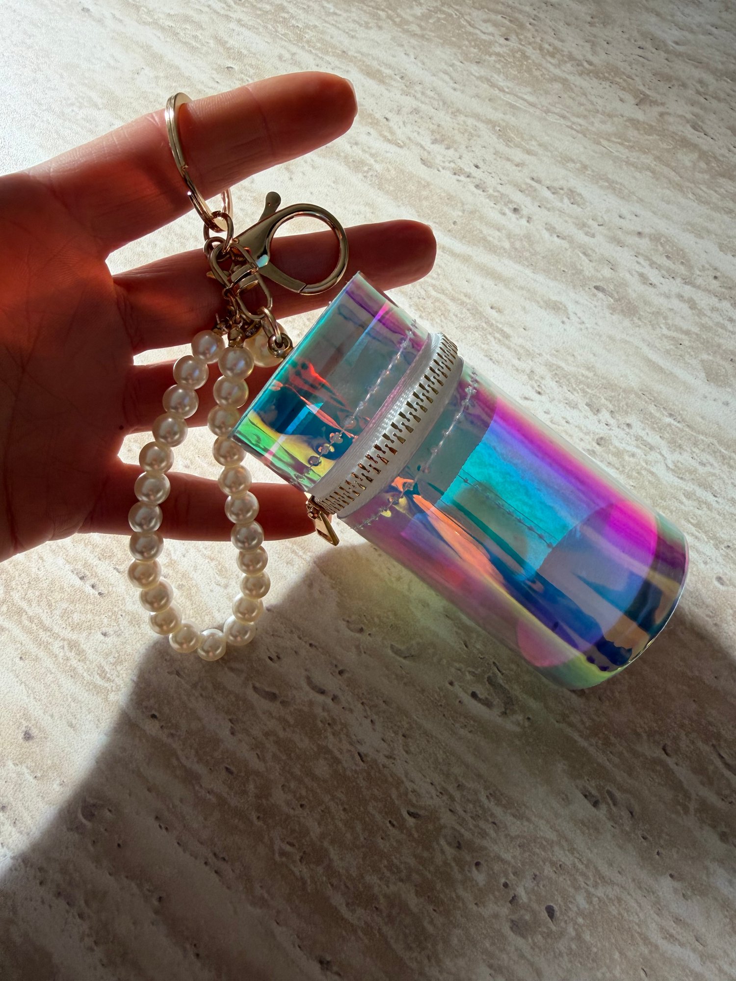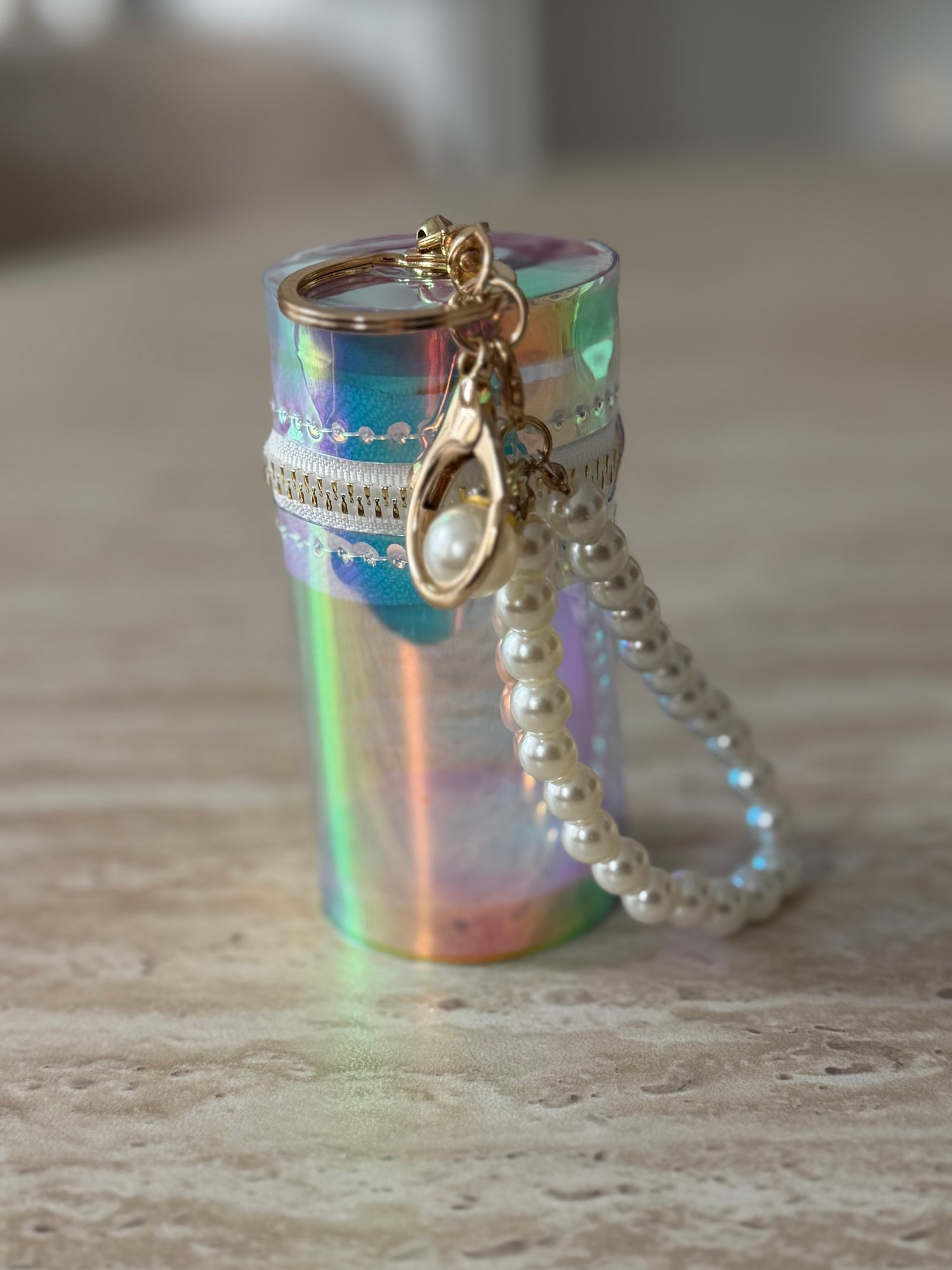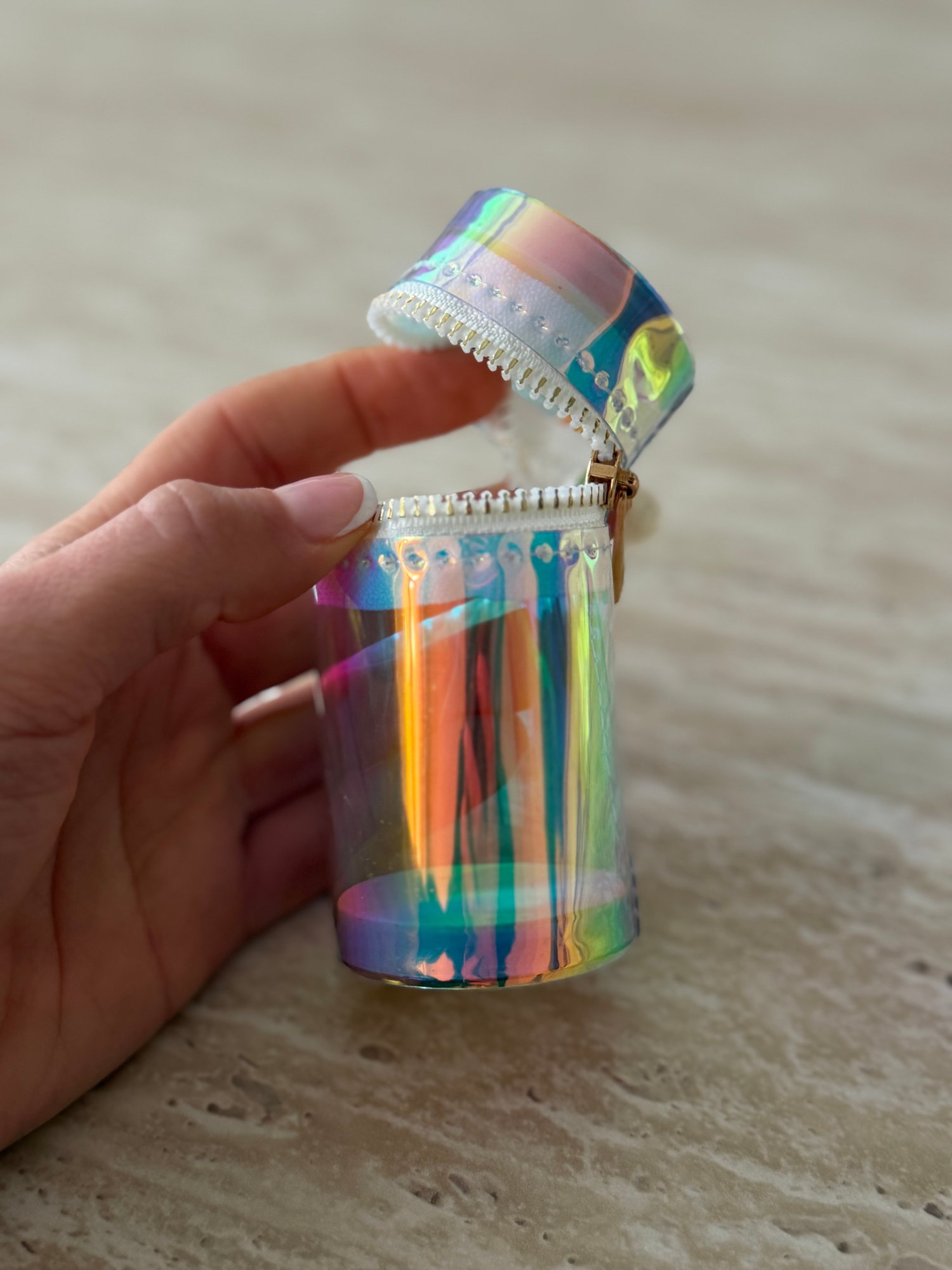 Étui cylindrique rigide à finition irisée, pensé pour accueillir un lipstick ou de petits indispensables. Fermeture zippée sécurisée.