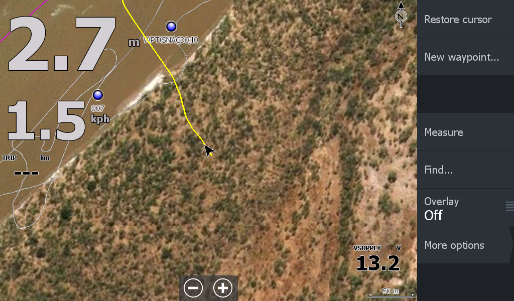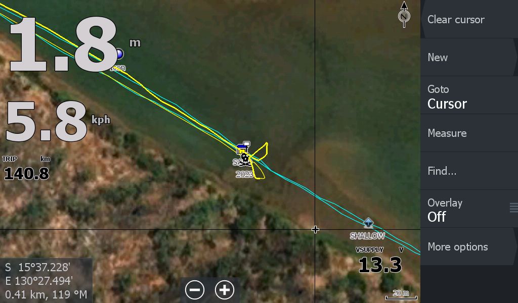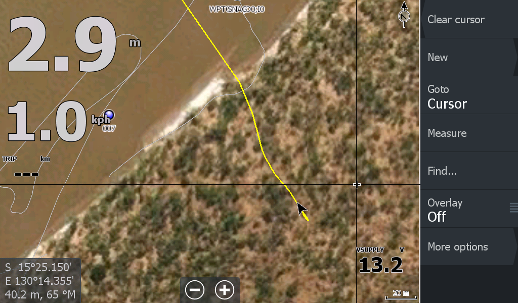 There is one issue with a section of the map down in the Golden mile / football creek , green island bend ( 70 km down from the Big Horse boat ramp) It will show your boat situated 100 metres or more over dry land bush bashing for a few kms as you round the bend. It's a little confronting when you are down there and the chart plotter is showing you are amongst the trees 5 metres higher up the embankment. It did my head in thinking I'd mucked up, but going through historical imagery, this section of river is on the move big time. 2 years ago it had a 3km long ,70 metres strip carved off it.( That is a massive volume of 3-5 metres high soil) The southern bank is eroding out the cliff face every year & other soil is being deposited on the northern part of the bend so it stays the same width and no-one notices its movement.