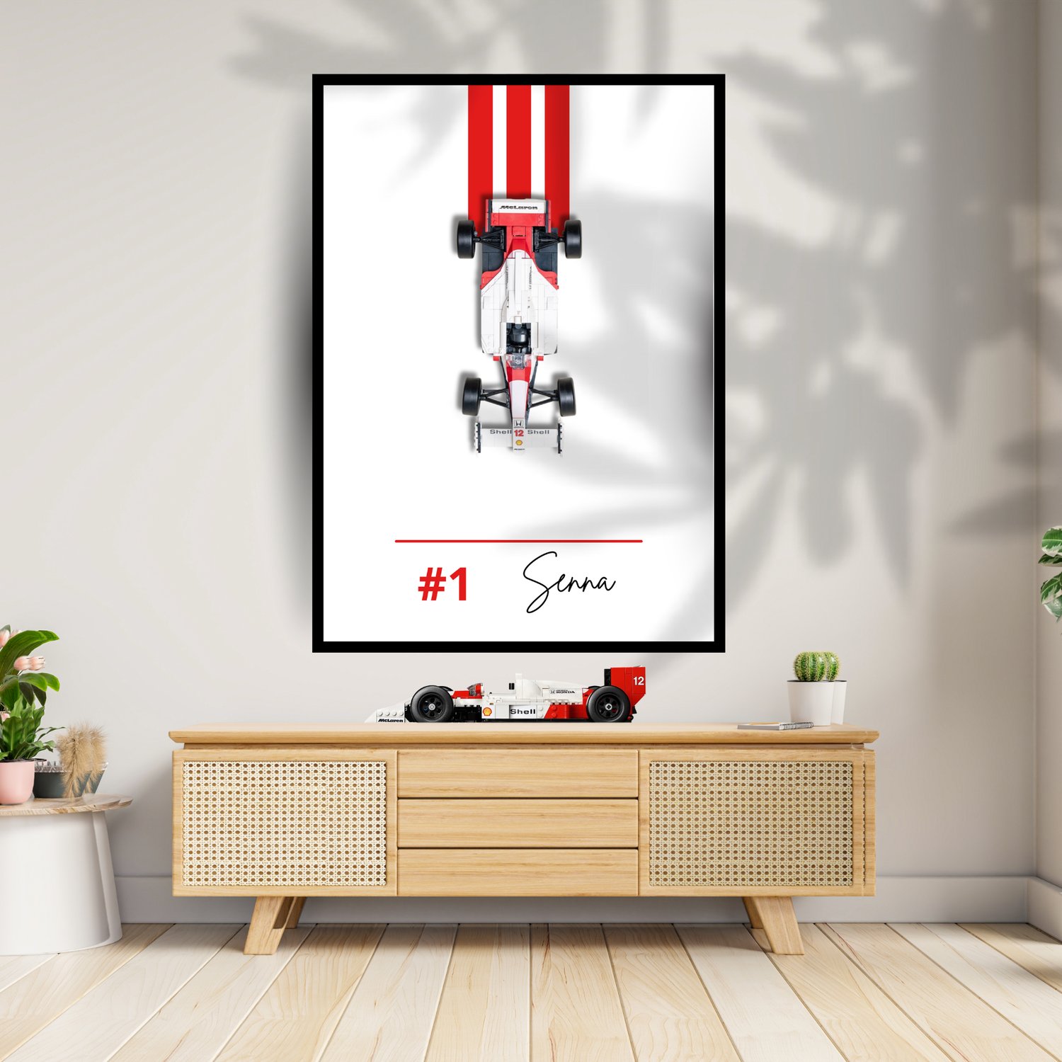 Digital poster compatible with the LEGO Icons Ayrton Senna McLaren MP4/4, specially designed to showcase your Formula 1 legend in a clean, modern, and premium display.