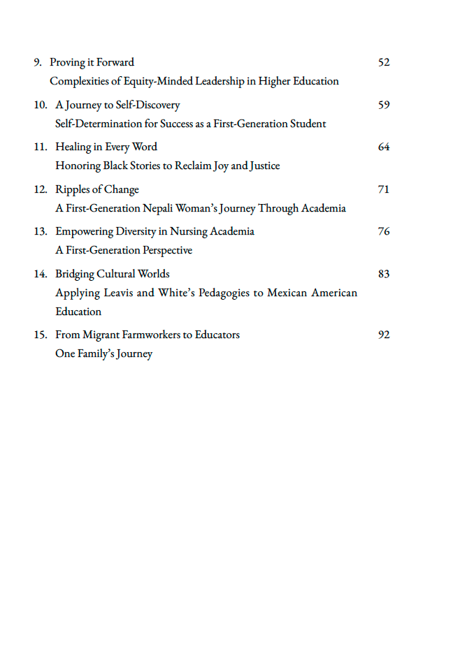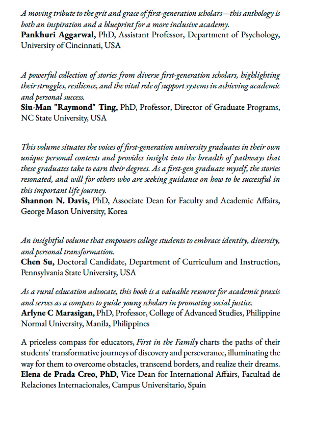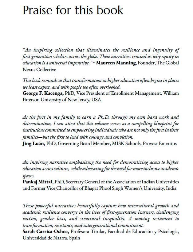 First in the Family: Stories of Resilience, Leadership, and Transformation Across Borders showcases the lived experiences of first-generation students whose journeys span cultures, continents, and disciplines. Through narratives of perseverance and identity, contributors share how they navigated barriers of poverty, migration, discrimination, and uncertainty to achieve educational success and leadership. From classrooms and research labs to communities and cultural spaces, their voices highlight the profound ways education transforms not only individuals but also families and societies. Both inspiring and instructive, this volume is an invaluable resource for students, educators, and policymakers seeking to understand and support the first-generation experience in a global context.