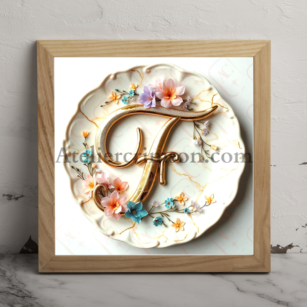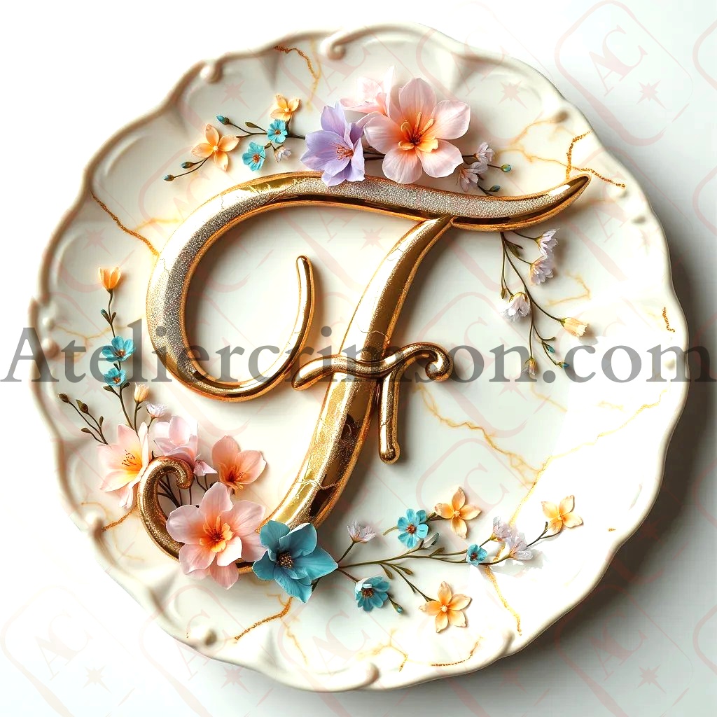 The letter F flowers and procelaine .Download Now this high quality AI-generated image, perfect for adding a touch of tranquility and creativity to any space.