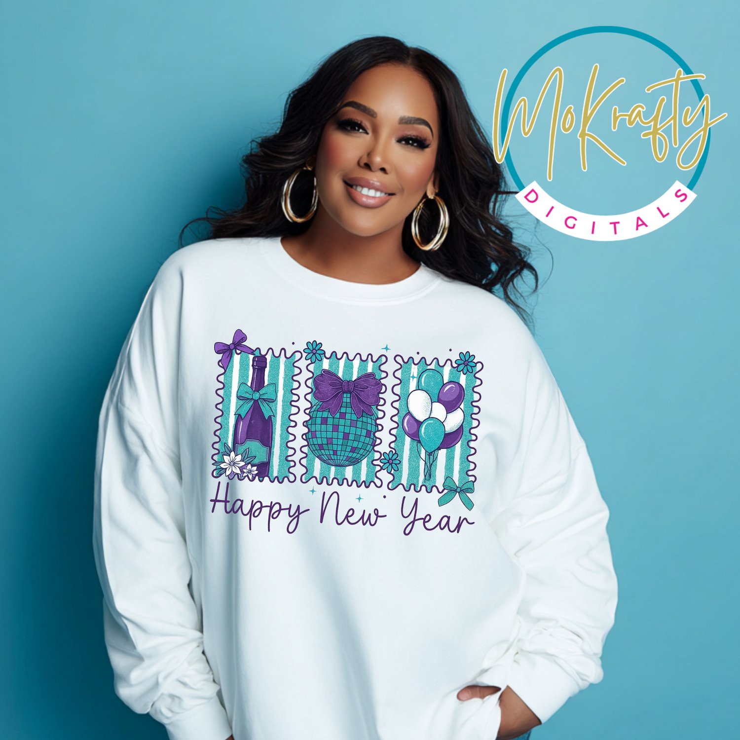 Celebrate the New Year in style with this Happy New Year PNG digital design, featuring rich purple and teal tones, disco ball glam, champagne bottle details, and festive balloons. This high-quality transparent PNG is perfect for crafters creating New Year’s shirts, tumblers, hoodies, party favors, and more. Designed for smooth sublimation and DTF printing.