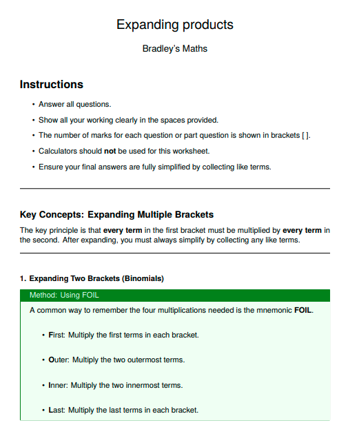 IGCSE Higher Maths: Expanding products (Worksheet & Model Answers)