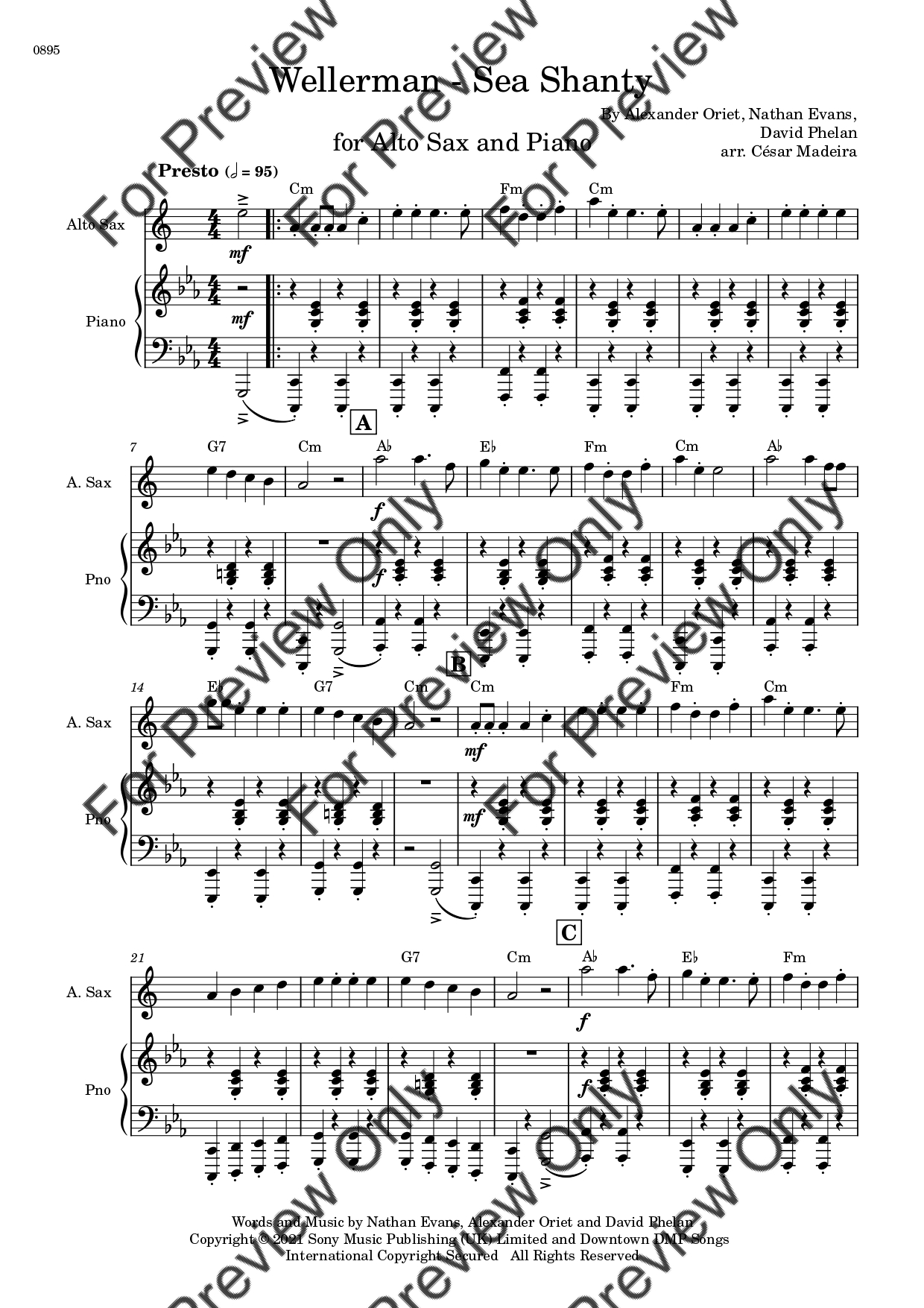 Wellerman (Sea Shanty) by Nathan Evans. Arrangement for Alto Saxophone and Piano. With Full Score and Individual Parts. Have fun!