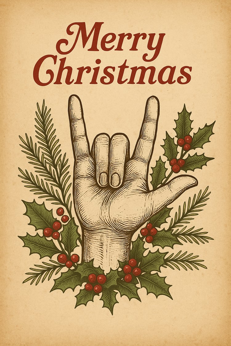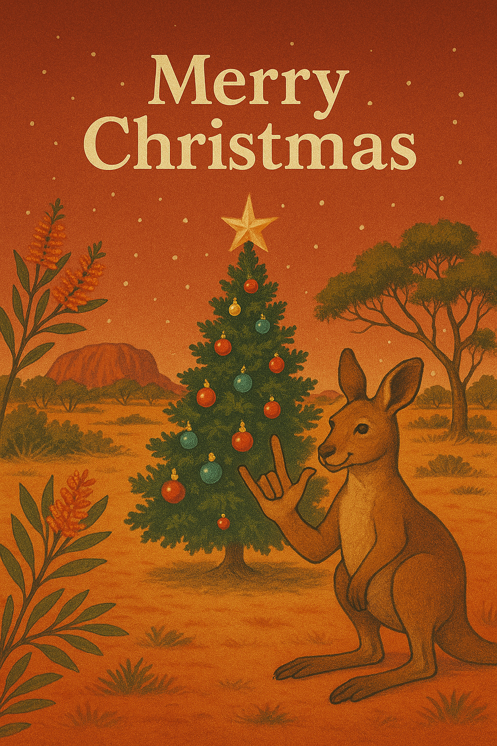 Celebrate Christmas the Aussie way! This beautifully illustrated Christmas card features a friendly kangaroo signing “I Love You” (ILY) in ASL beside a decorated Christmas tree under the warm Australian outback sky. Perfect for spreading love, inclusivity, and festive cheer across cultures.