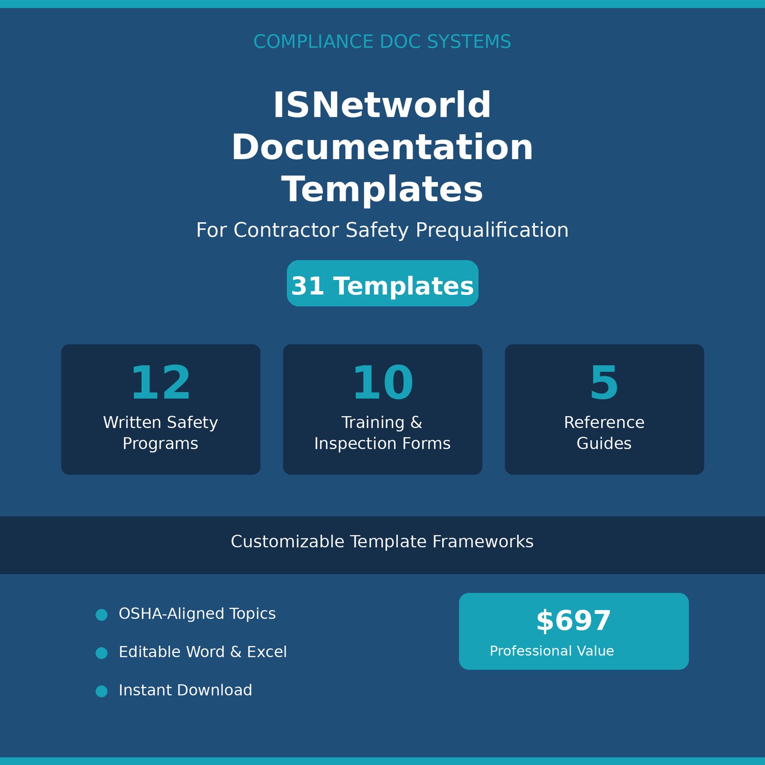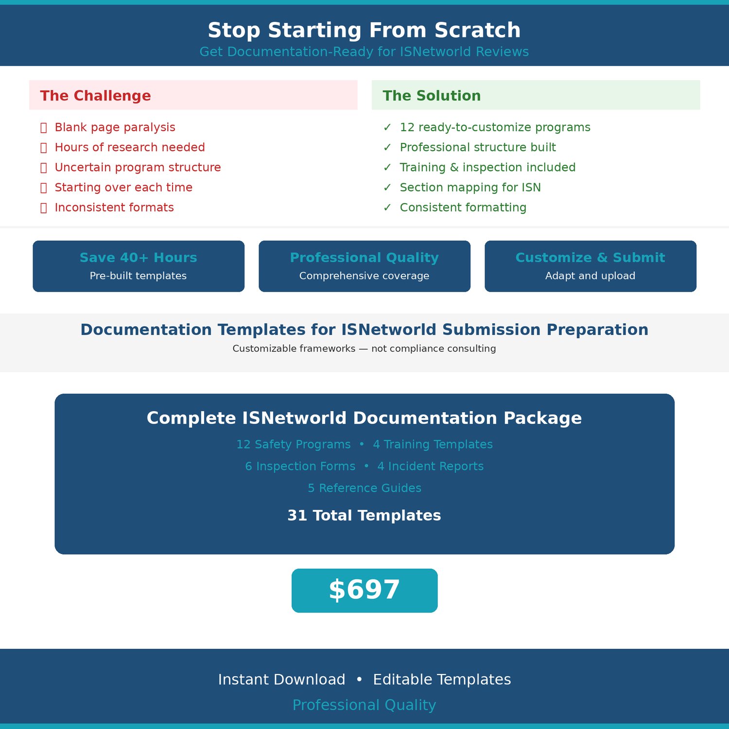 This package provides structured written safety program templates and documentation tools commonly associated with contractor prequalification preparation for ISNetworld and similar platforms.