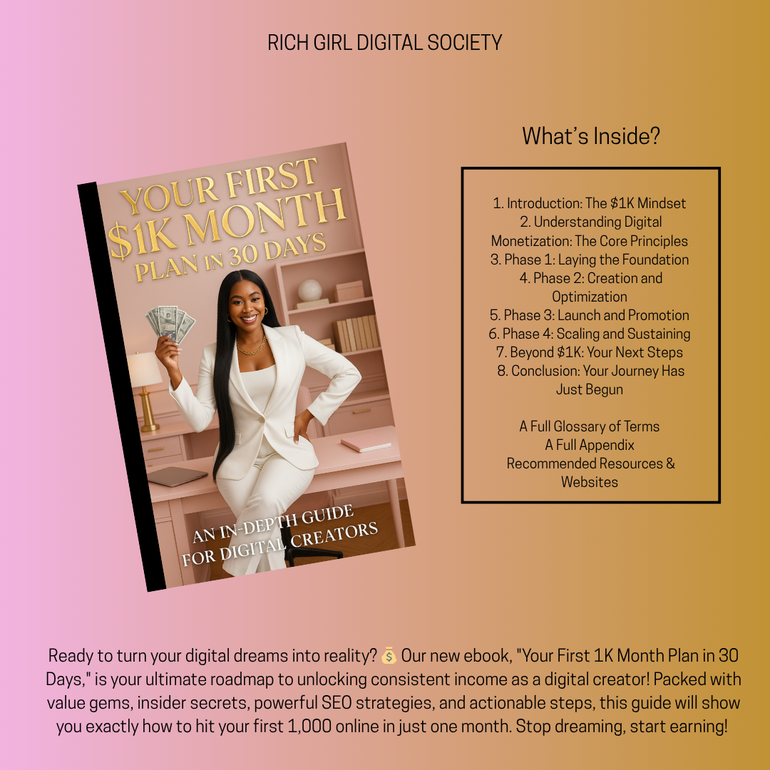 Ready to turn your digital dreams into reality? 💰 Our new ebook, "Your First 1K Month Plan in 30 Days," is your ultimate roadmap to unlocking consistent income as a digital creator! Packed with value gems, insider secrets, powerful SEO strategies, and actionable steps, this guide will show you exactly how to hit your first 1,000 online in just one month. Stop dreaming, start earning!