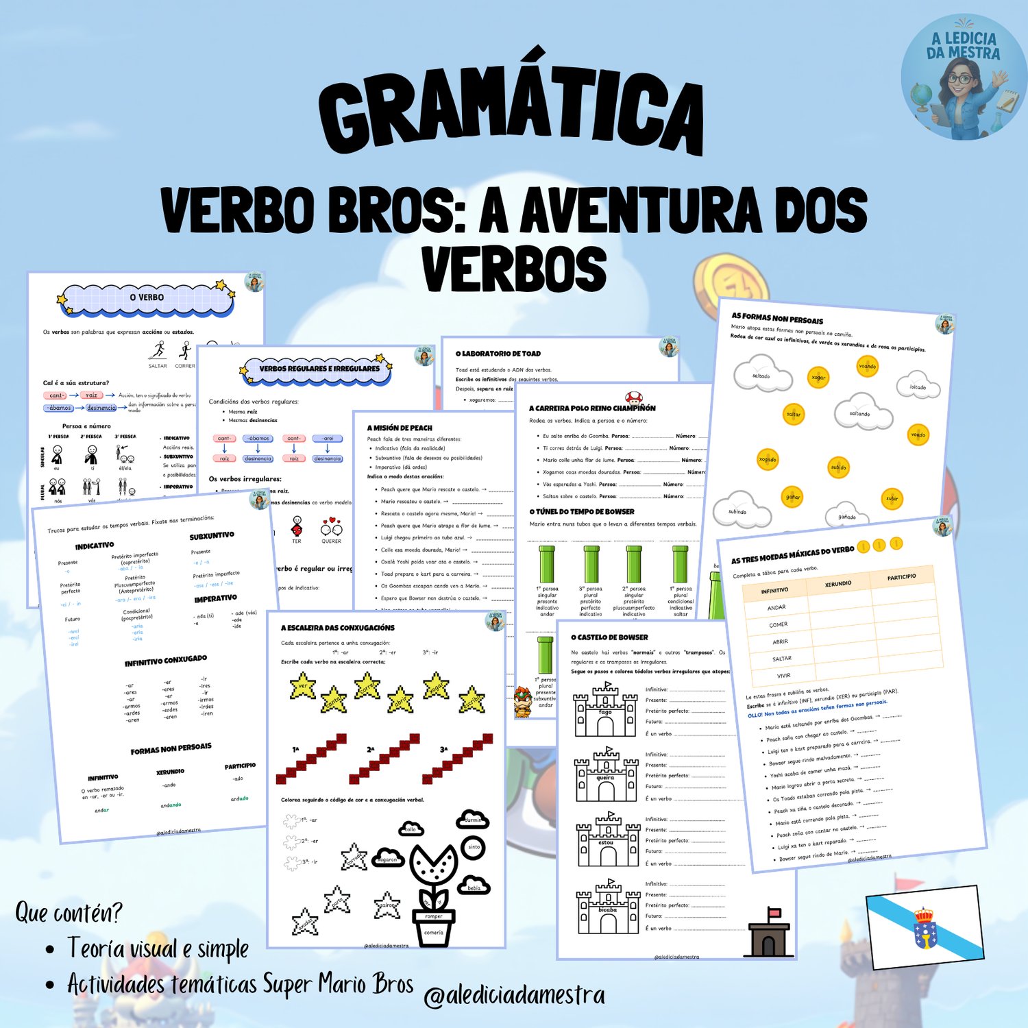 - Caderno Verbos Bros: para practicar todo o aprendido con temática Super Mario Bros.
