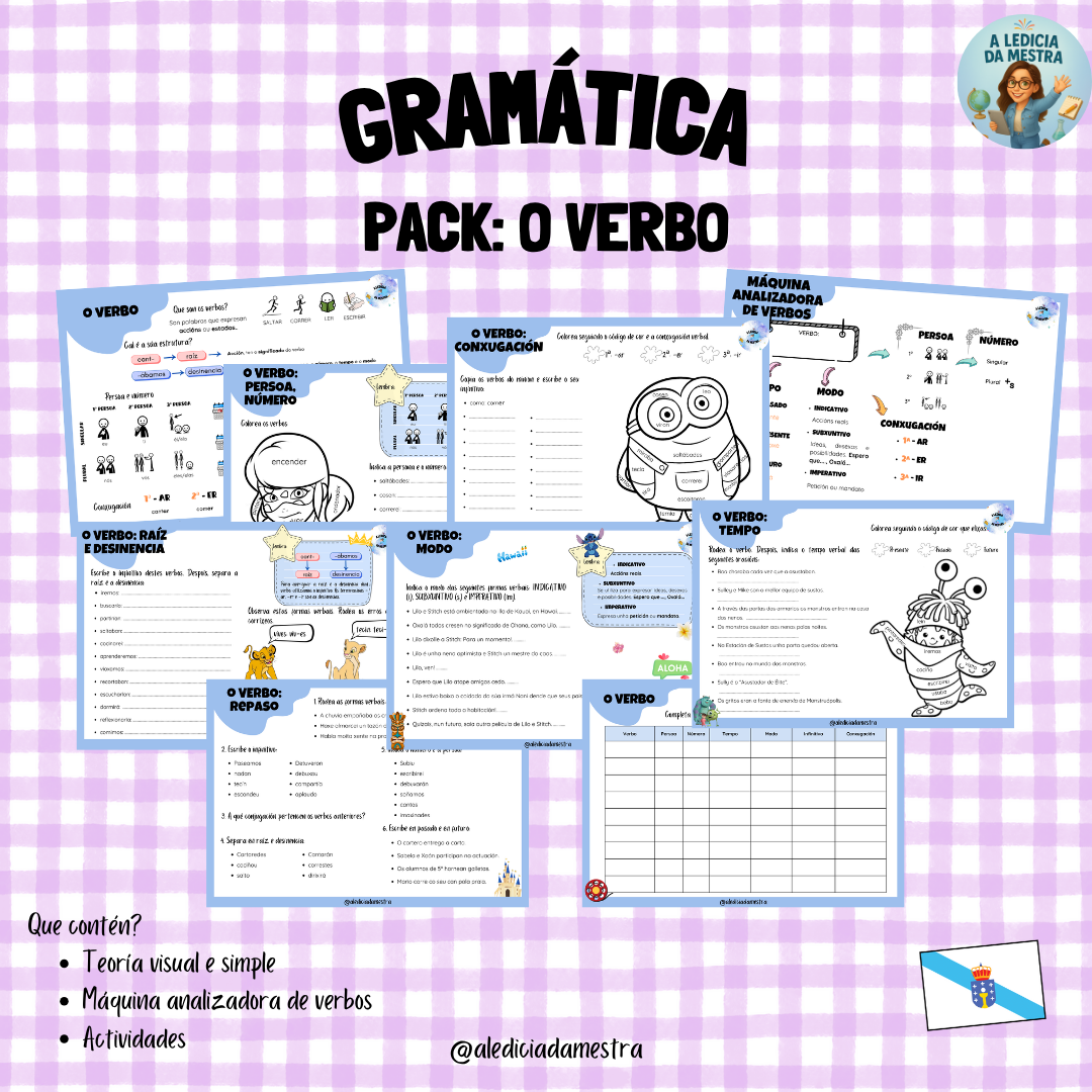 - Teoría dos verbos adaptada con pictogramas de ARASAAC (número, tempo, persoa, conxugación...)