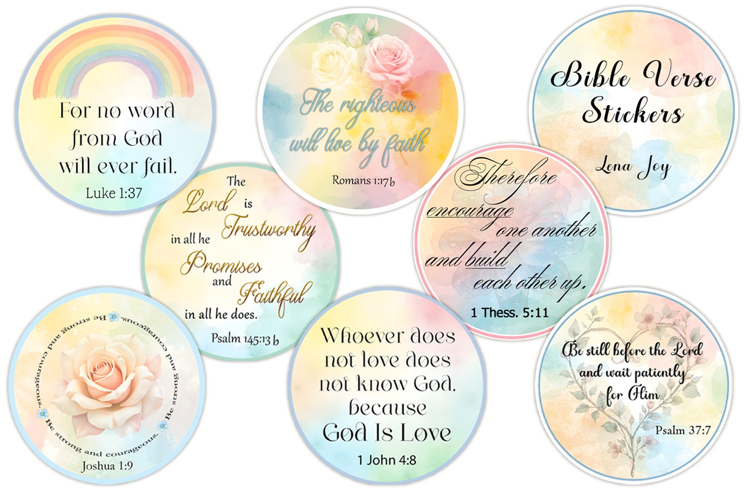 Keywords—pastels, round, circle, Bible, Bible verse, God, religious, sticker, flowers, bird, rainbow, promises, encourgement