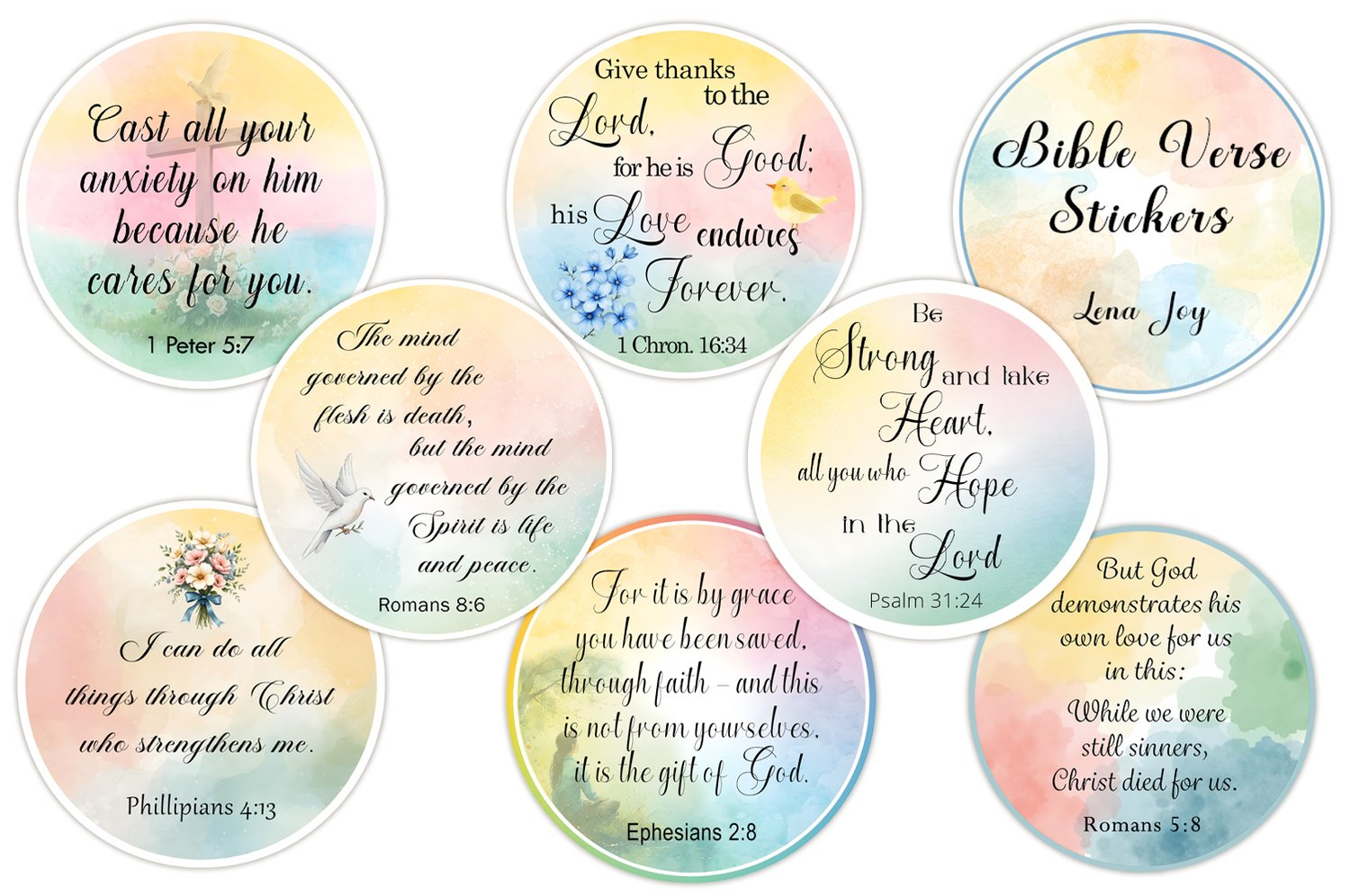 Fourteen watercolor stickers with a Bible verse on each one to encourage you and others. They can also be used for scrapbooking, junk journals, cards, gifts, and even on tags. Send them to friends, family, and people you know who will be encouraged or uplifted by receiving one.