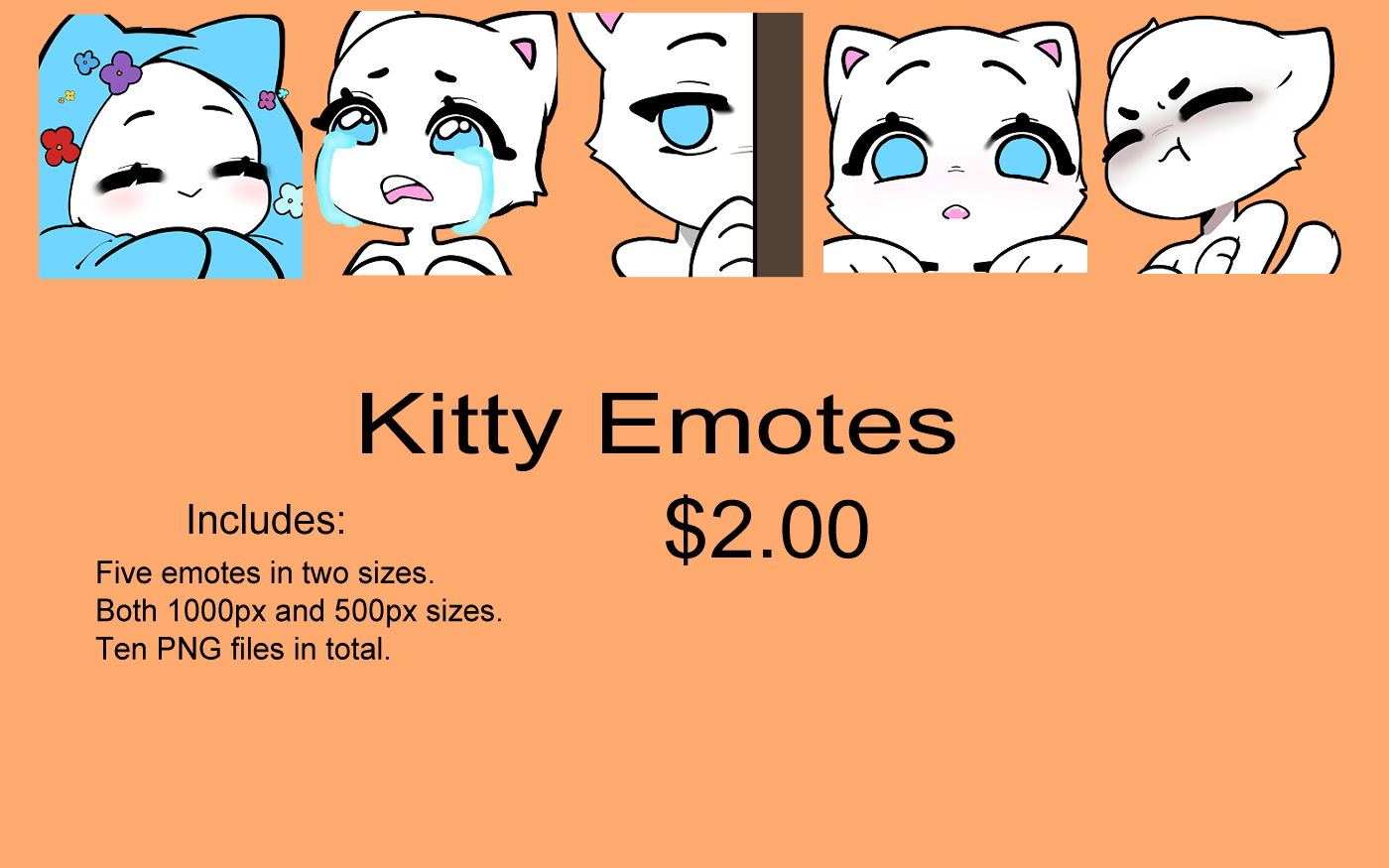 This contains Emotes of a Cat with White Fur and Blue Eyes, and can be used in places such as Discord or Twitch. They come in Blank size by Blank size at 300dpi, as well as blank size by blank size, also in 300dpi. They may need to have their size modified in some cases to work with specific content or on specific sites.