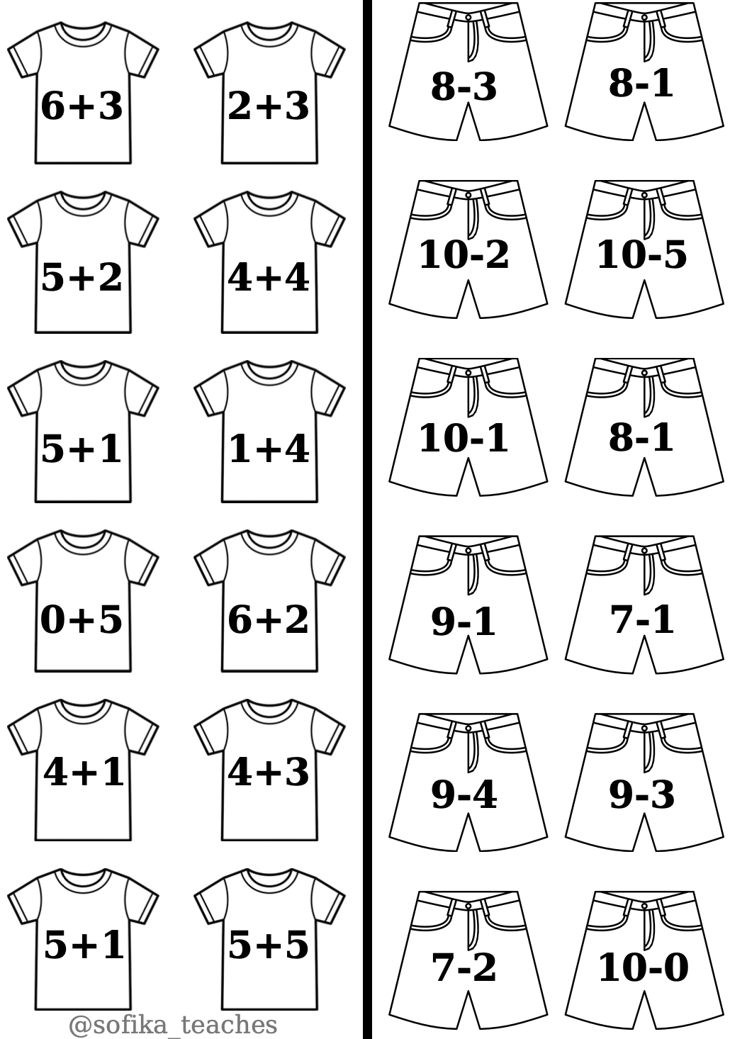 - Ασκήσεις πρόσθεσης (στα μπλουζάκια) και αφαίρεσης (στα σορτς) με αριθμούς μέχρι το 10.