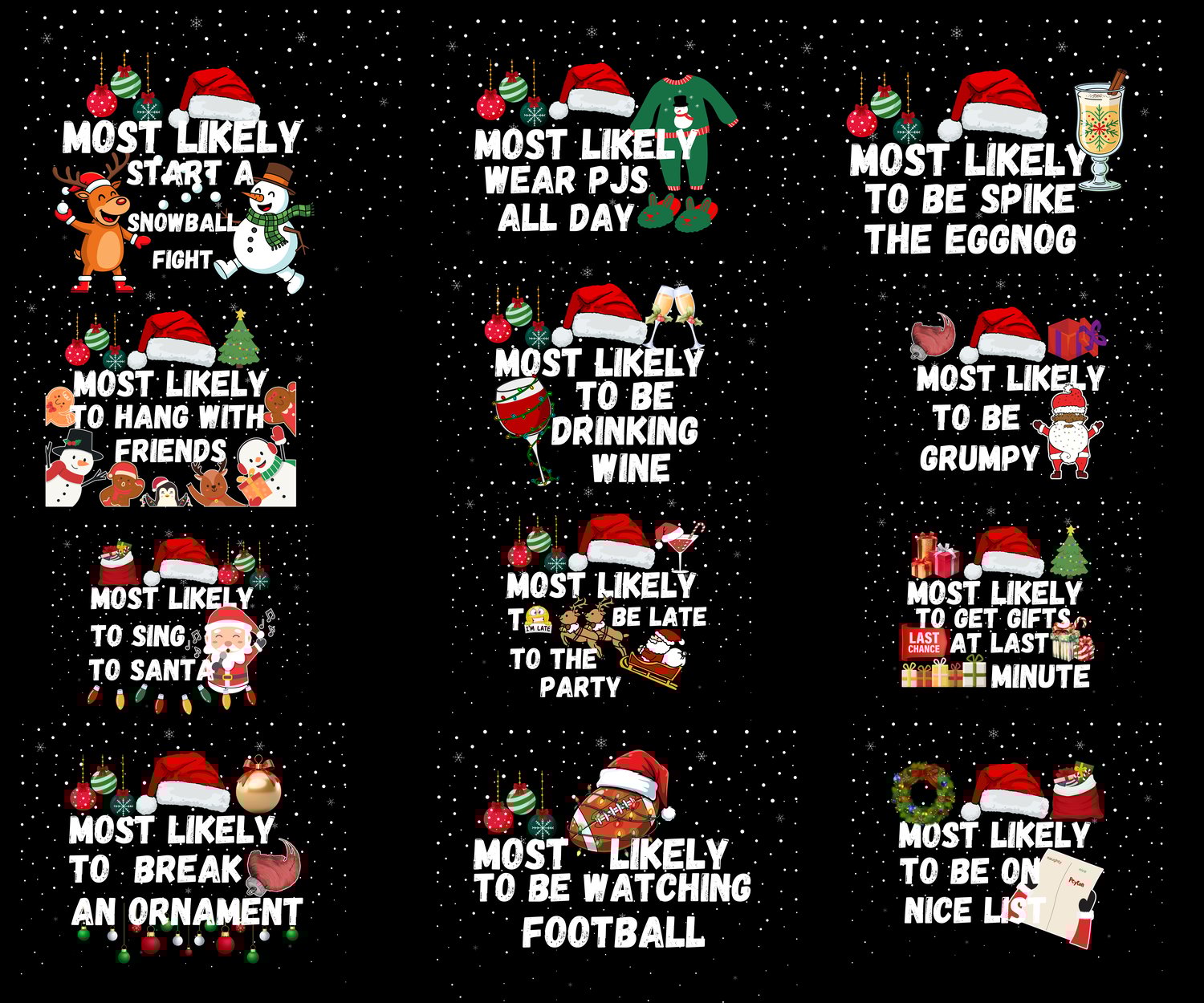 Each design features a bold “Most Likely…” phrase paired with festive holiday graphics that everyone in the family can relate to. Phrases from the football watcher to the last-minute shopper 😄🎅