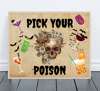 Vintage parchment-style background with an intricate flowered skull illustration surrounded by fun and mysterious drinks. Pick Your Poison title in spooky font and colorful but understated images. Great bar / drink sign for any event or label to sit at your front door or favor table. Instant download, easy to print and frame.