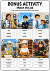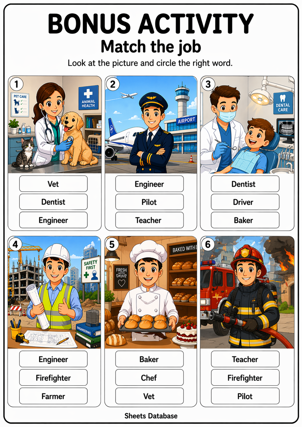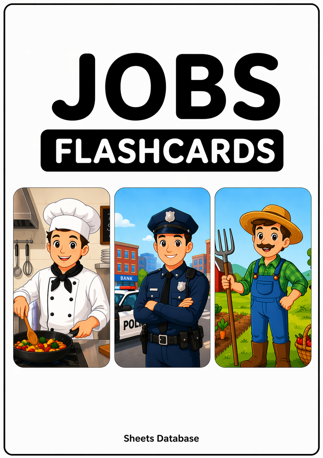 - 12 job flashcards (Doctor, Teacher, Firefighter, Police Officer, Chef, Nurse, Pilot, Farmer, Engineer, Dentist, Vet, Baker)