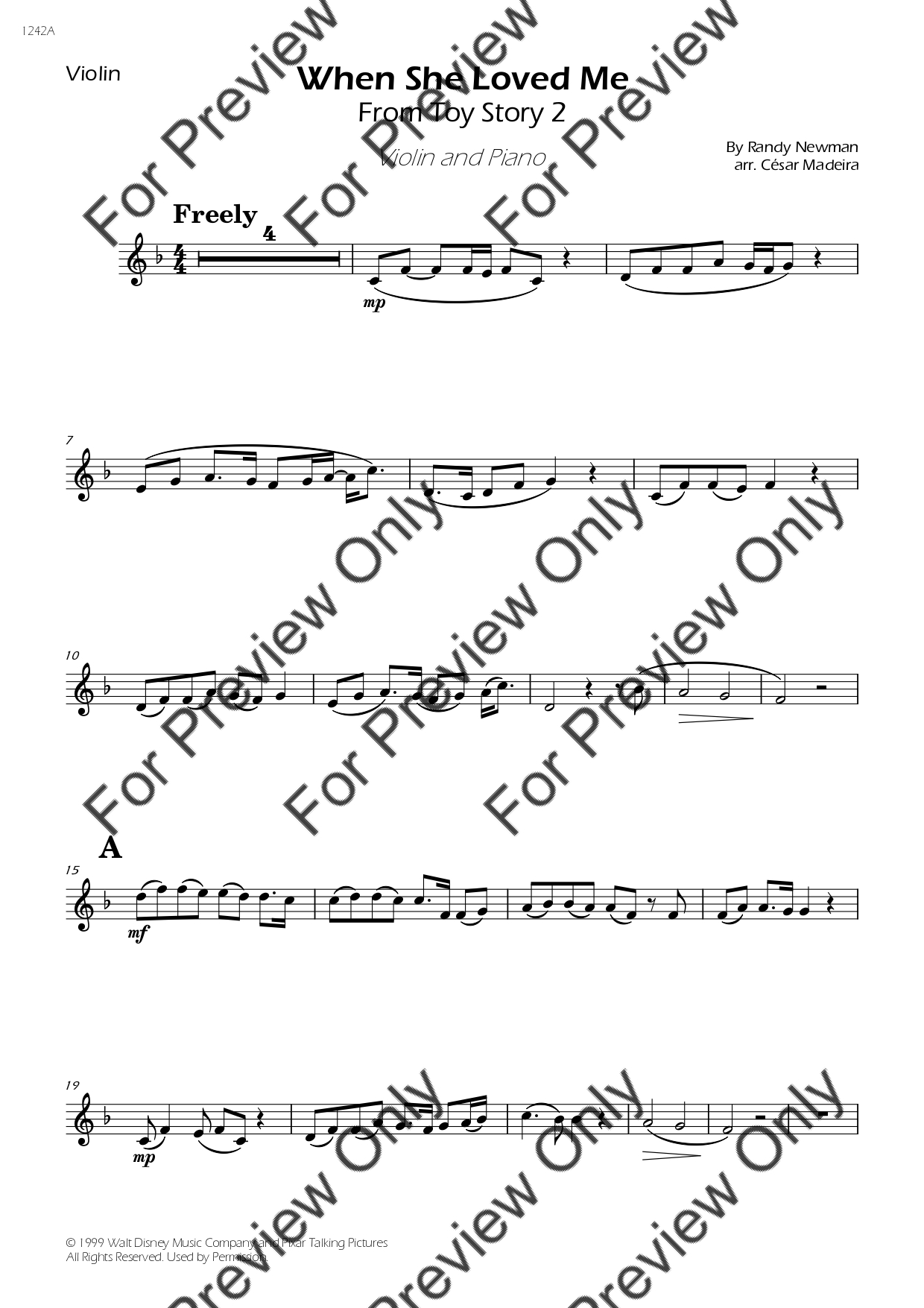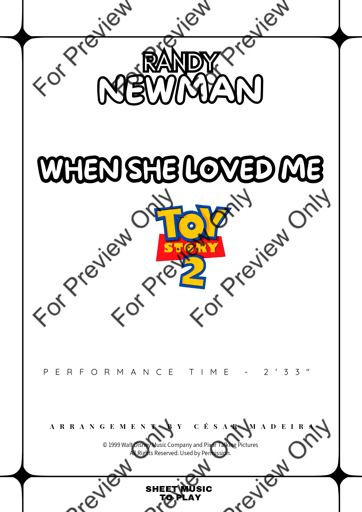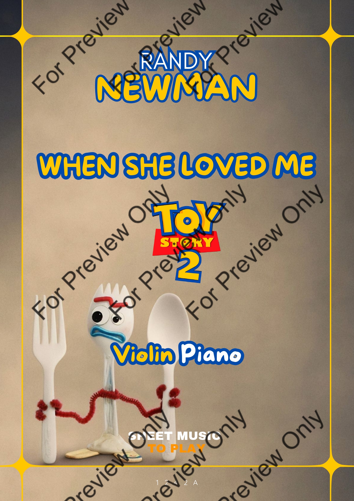 When She Loved Me from Toy Story 2 by Randy Newman. Arrangement for Violin and Piano. With Full Score and Individual Parts. Have fun!