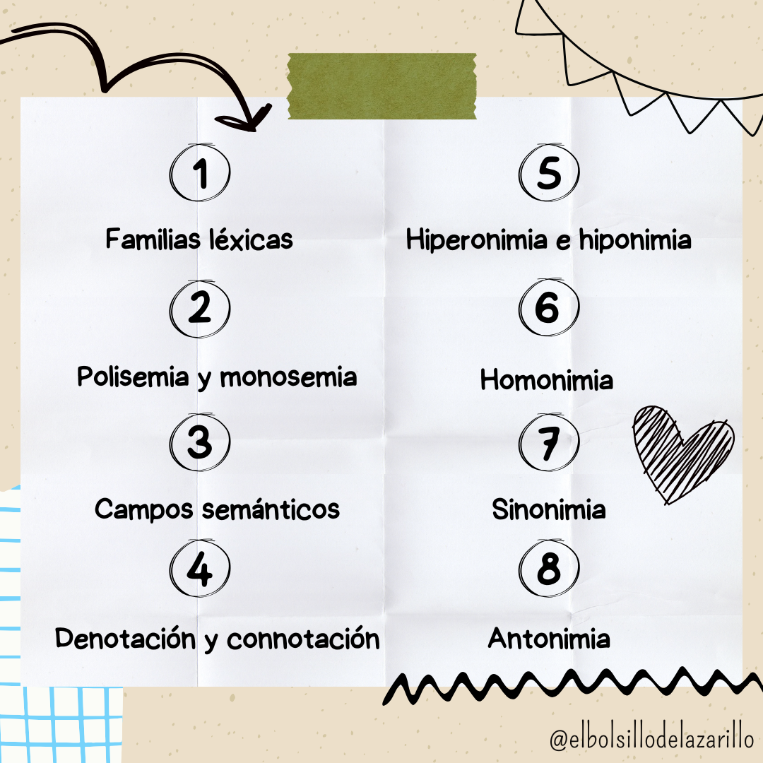 ¡Hola, lazarillos y lazarillas! Os comparto esta información sobre las relaciones semánticas que he estado recopilando y sintetizando para 1.º ESO, aunque también sirve para otros niveles.