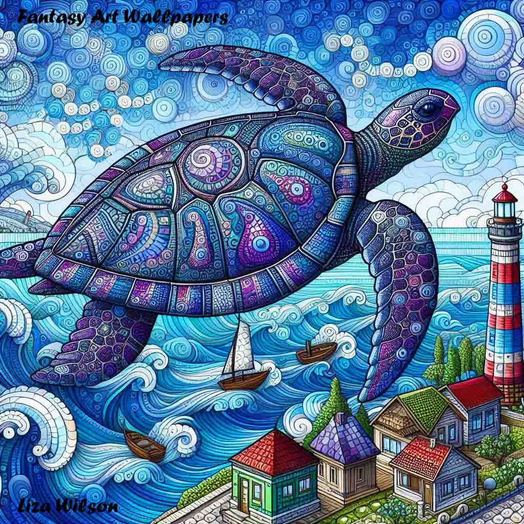 Colourful giant sea turtle & baby sea turtle spirograph style jumping through curly frothy waves. There is a lighthouse, ships & a little beach.