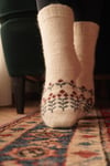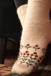 Main Color (cream): One 100 g skein of fingering weight sock yarn is sufficient for all sizes. The exact quantity of yarn needed will vary based on your desired leg and foot lengths. The sample uses Les Brebis du Beaurivage Petite Frisonne X-Fine in the Natural Fawn Alpaca color (60% wool, 20% alpaca, 20% nylon; 453 m / 495 yds – 110 g).