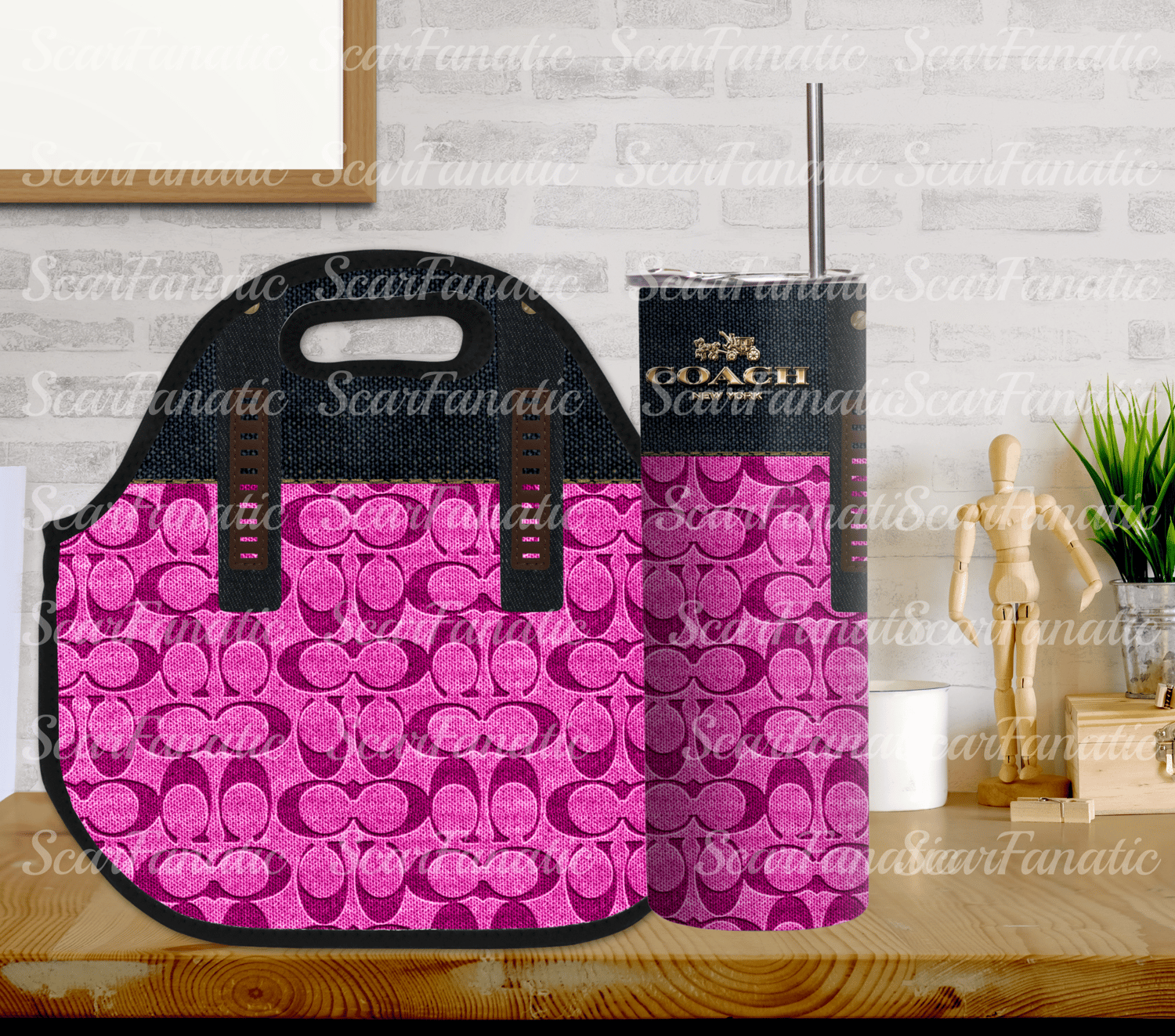 Pink Blue and Brown Denim 20oz Skinny Tumbler and Lunch Tote PNG Design Bundle, Sublimation