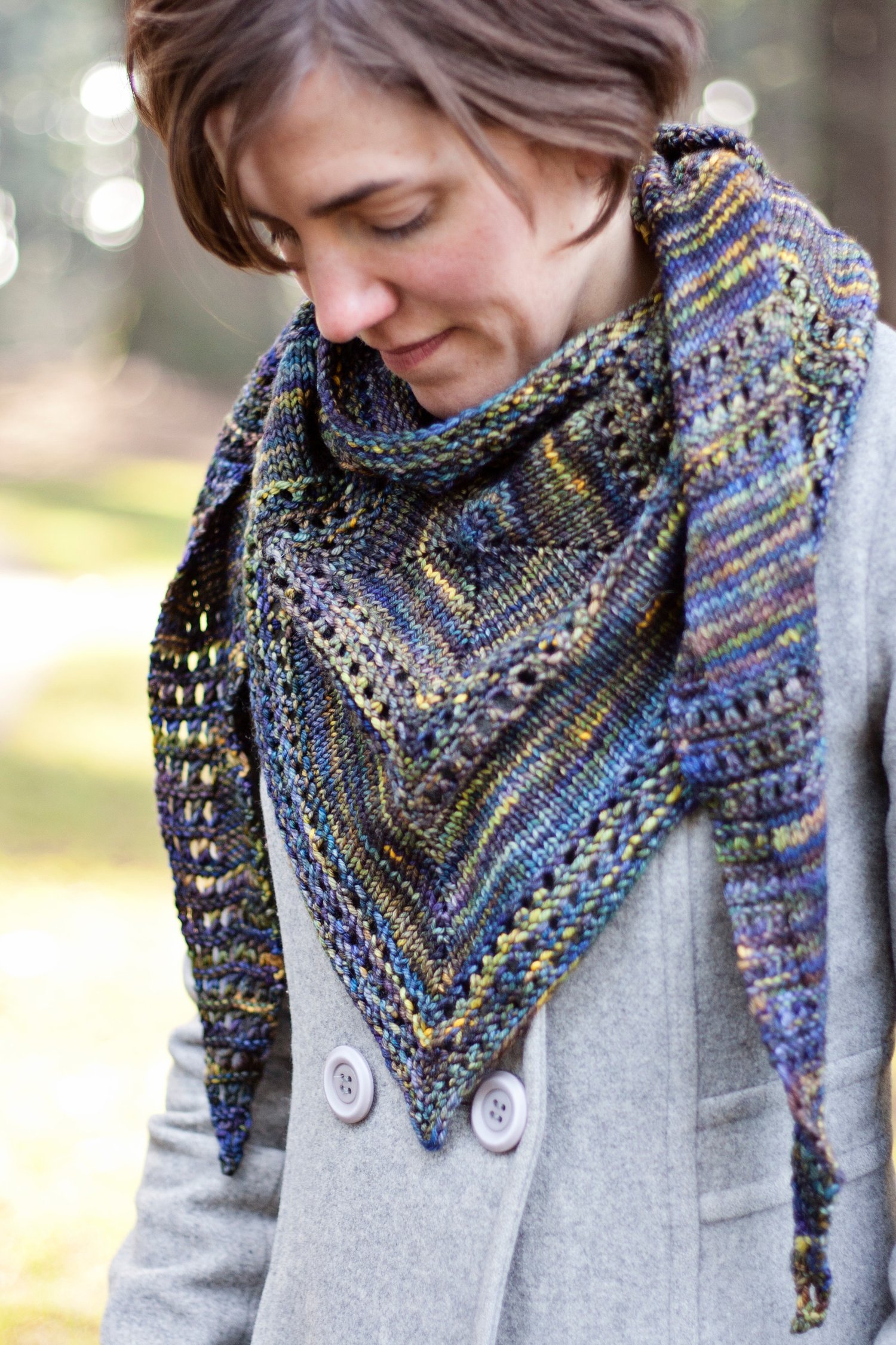 It’s funny how seemingly simple words can evolve into different but related concepts over time. The Latin verb “lustro” referred to the circular movements priests made during a ritual purification. The word has since evolved into concepts in Italian, Spanish, Polish, and English that range from “to shine” to “a mirror” to “a five year period.” Similarly, this relatively simple shawl (and its matching hat and mitts patterns) mix standard ideas—mostly stockinette stitch, with a little eyelet work—to create a new set of knit ideas.