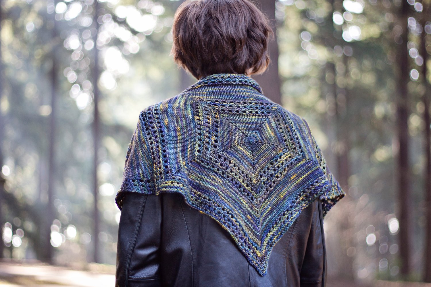 Construction of this shawl is a little different from the norm; first you start with a pentagram knit in the round, then you bind off stitches along three sides, leaving live stitches to form two arms. These are knit flat and taper naturally to a point.