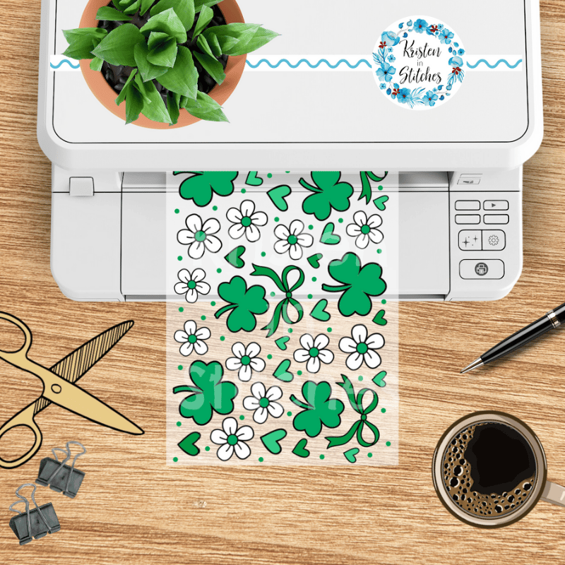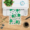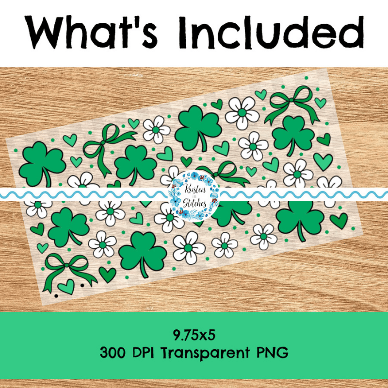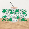 Features green shamrocks, daisy flowers, hearts and bows.