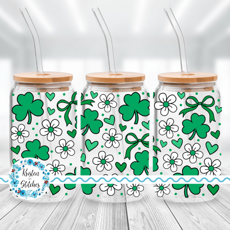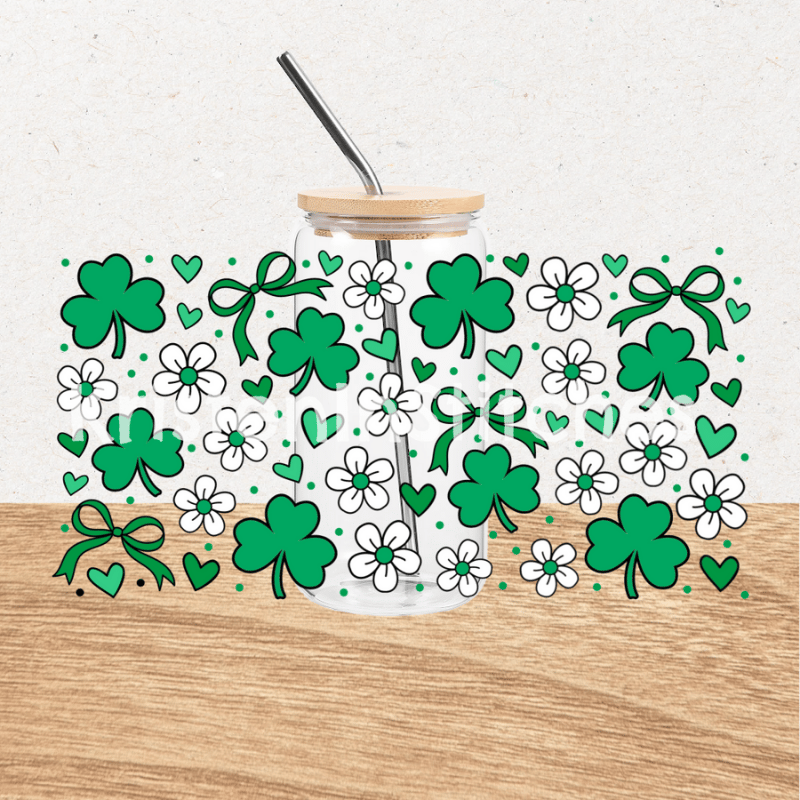 Shamrock Glass Can Wrap Transparent PNG, Coquette Bows and Daisy Flowers, Saint Patrick's Day