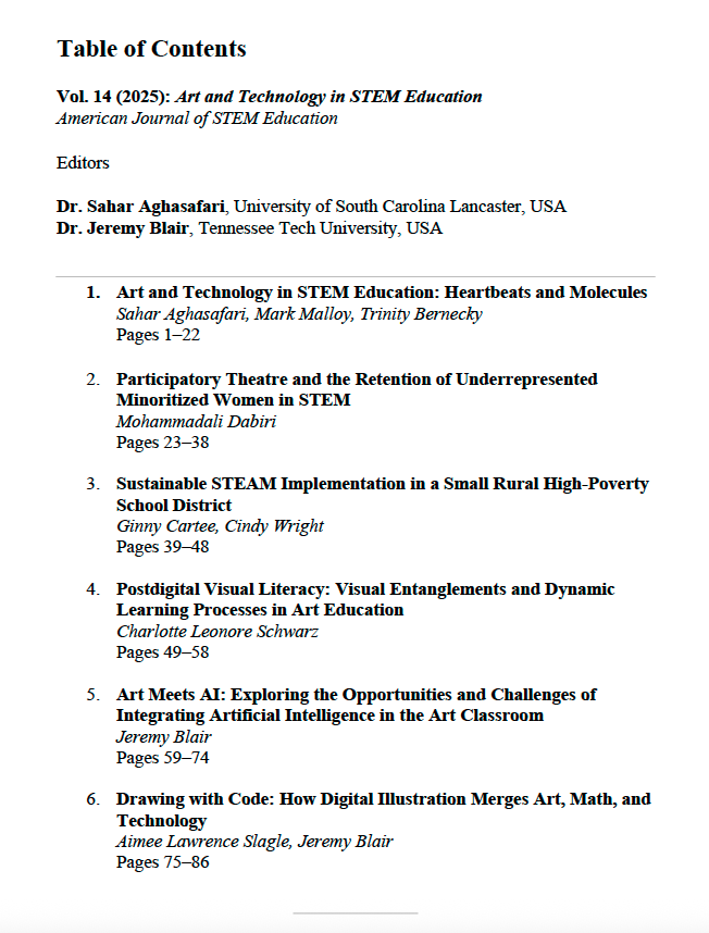 This volume of the American Journal of STEM Education spotlights the transformative fusion of art and technology in reimagining STEM education. From AI-enhanced creativity and graphic storytelling to participatory theatre and digital illustration, the volume captures the dynamic potential of STEAM approaches to foster deeper engagement, equity, and innovation. Through diverse perspectives and bold pedagogical insights, this collection challenges traditional boundaries and affirms the role of artistic expression as essential to shaping inclusive, interdisciplinary, and future-ready learning environments.