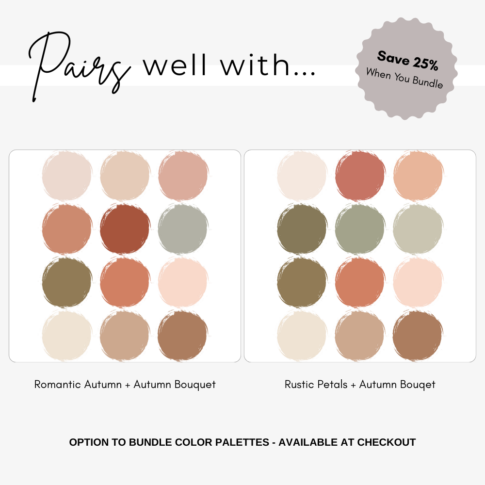 Create a cozy aesthetic for your brand with our soft Autumn Bouquet Color Palette. Perfect for DIY branding for Etsy sellers, entrepreneurs, and small business owners. Featuring a stunning array of muted fall brand colors (muted moss green, orange, soft peach, ivory, beige, muted brown) our pack provides Hex Codes, RGB, and CMYK values for seamless integration into your website color scheme and marketing materials. Embrace the warmth and richness of seasonal colors to captivate your audience and elevate your brand. Whether you're launching a new business or refreshing your current look, our soft Autumn Bouquet Color Palette is the perfect solution for creating a memorable and professional presence. Get ready to make your brand unforgettable with this essential tool for any creative entrepreneur!