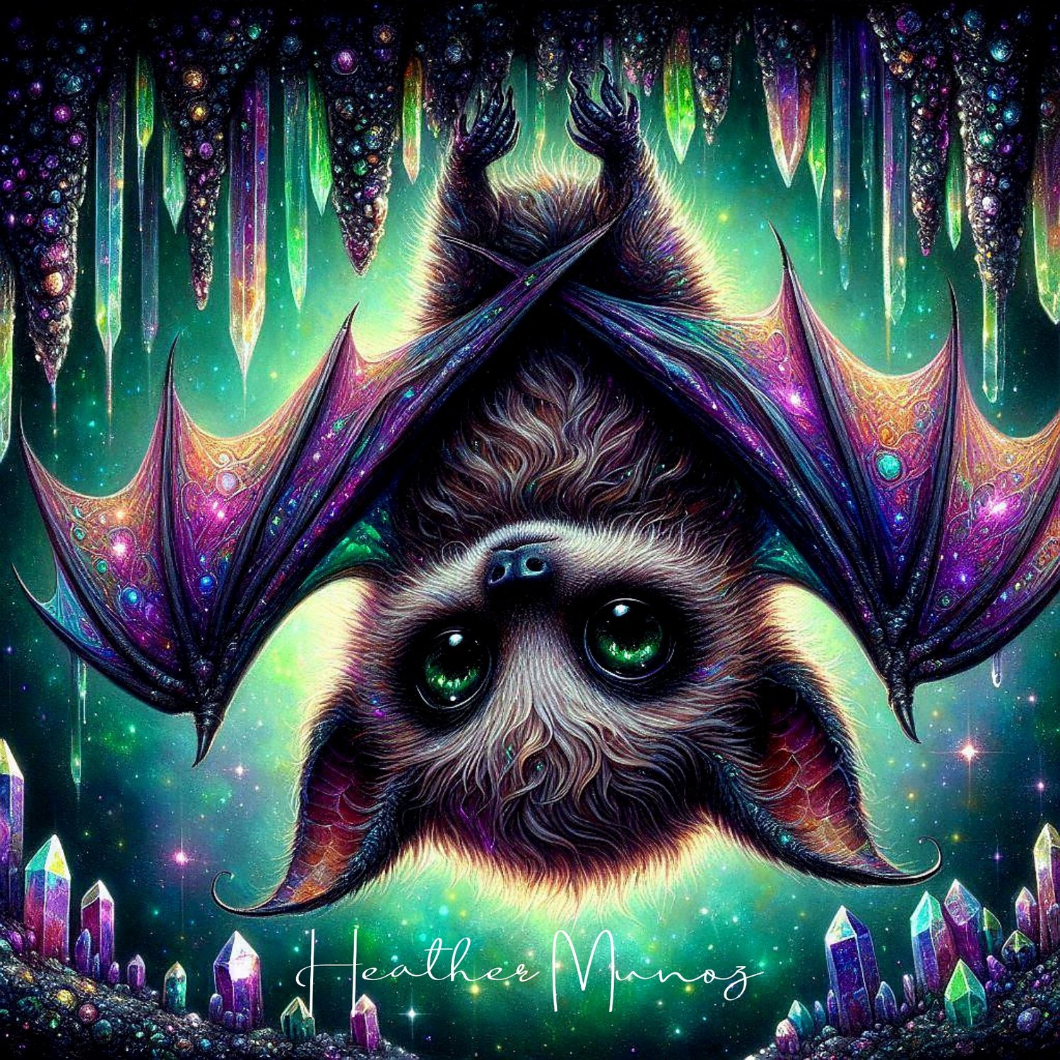 Beautiful Whimsy bat with gorgeous irredescent wings, in a sparkling cave of turquoise and purple crystals.