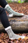 Samples were knit with Retrosaria Rosa Pomar ‘Mondim’ (100% Fine Portuguese Wool, 421 yd / 385 m per 3.5 oz / 100 g) in colorways 306 (green) and 100 (undyed). Ankle length sample uses 306 as MC and 100 as CC, and mid-calf sample vice versa.