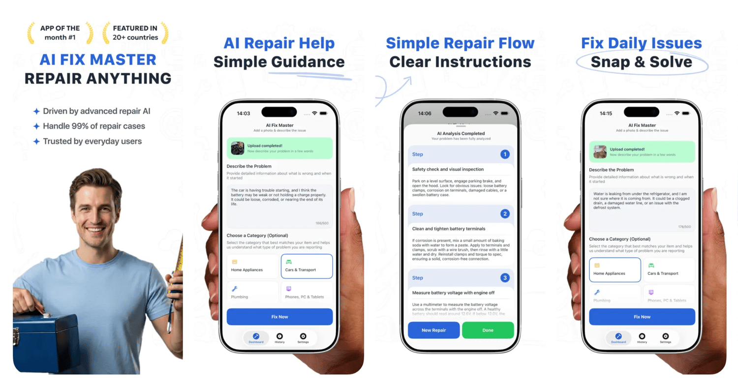 DIY home repair and maintenance apps are a high-demand, evergreen niche. AI Fix Master combines photo-based problem detection, guided repair flows, and practical instructions in a clean, easy-to-use experience.