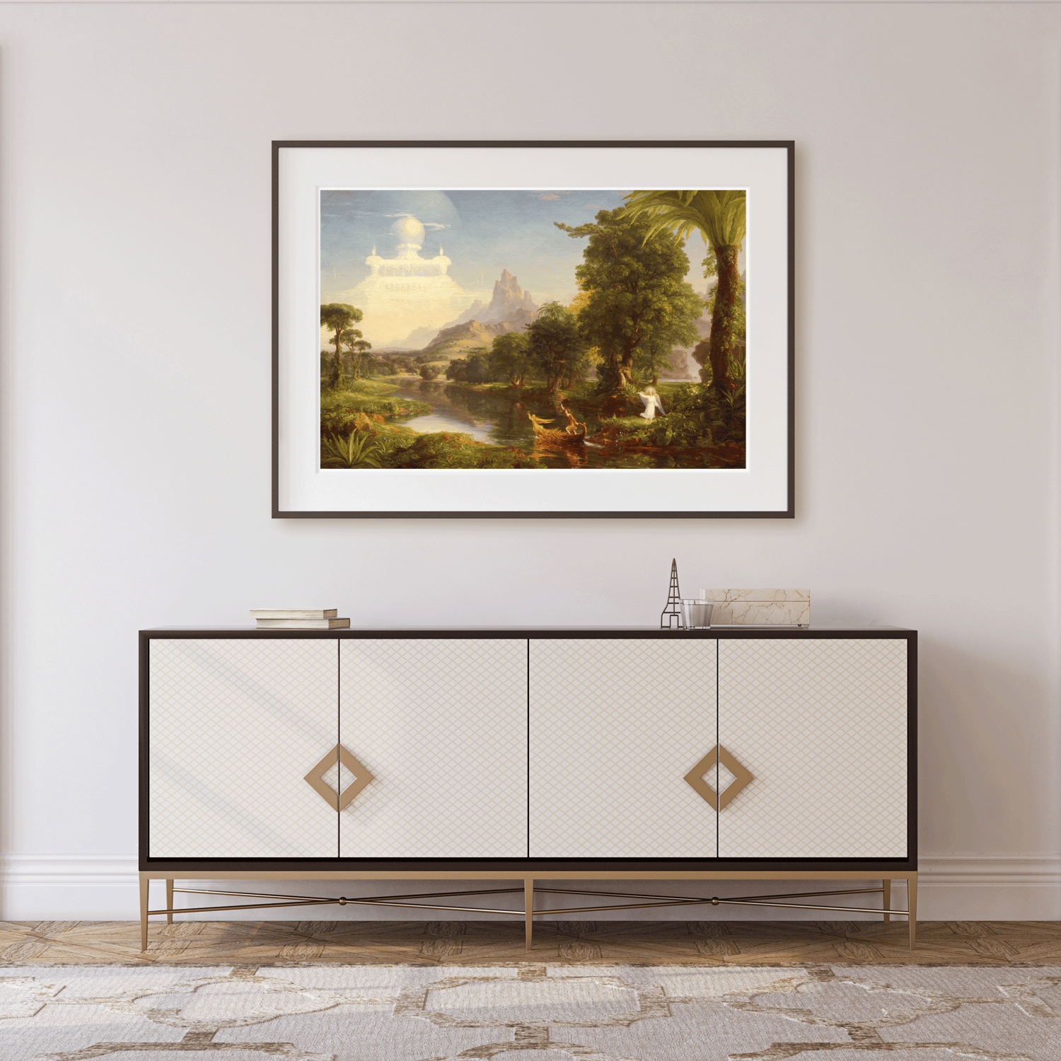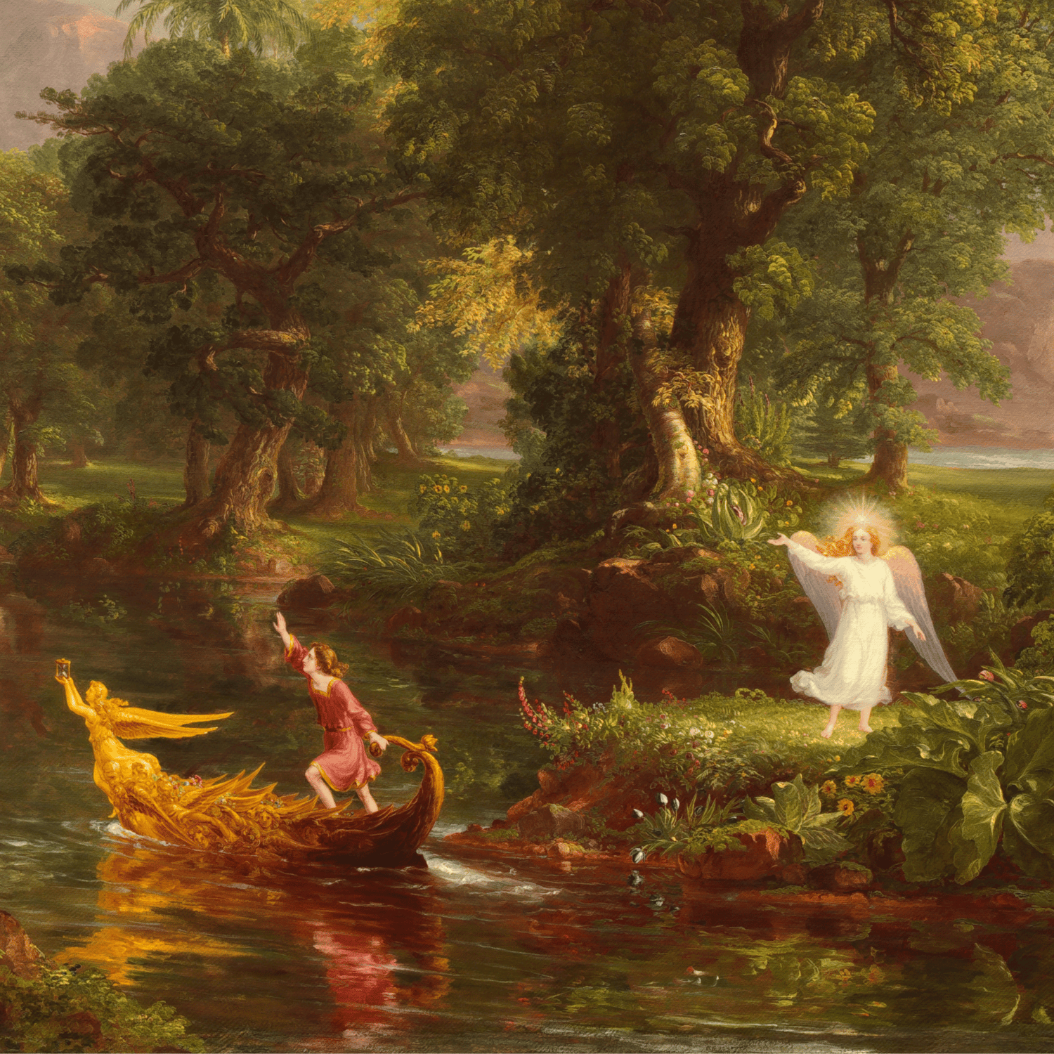 Experience the profound journey of life through Thomas Cole's masterful painting, The Voyage of Life: Youth. It captures the beauty and complexity of our existence, blending rich symbolism with stunning landscapes. Youth represents ambition, dreams, and the desire to achieve greatness. This painting is a thoughtful example of 19th-century Romanticism, focusing on humanity's connection to nature and the divine, as well as the philosophical exploration of life’s transient nature.