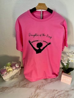 Wear you Faith with this "Eterni-tee" Daughter of The King T-shirt, for Matthew 9:22, "But Jesus turned him about and when he saw her, he said, Daughter, be of good comfort; thy faith hath made thee whole. And the woman was made whole from that hour." Sizes from XS-5XL. More colors available upon request.