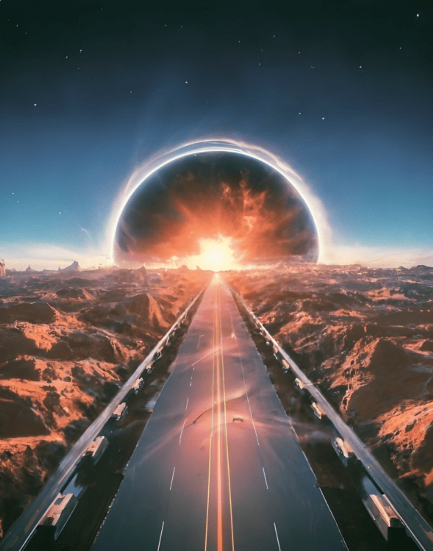 Light Explosion, Space, Highway, Modern Architecture,, Loneliness, Vintage Landscape, Nostalgic Nature, Cool Nature, Rustic natural Landscape, Painting.