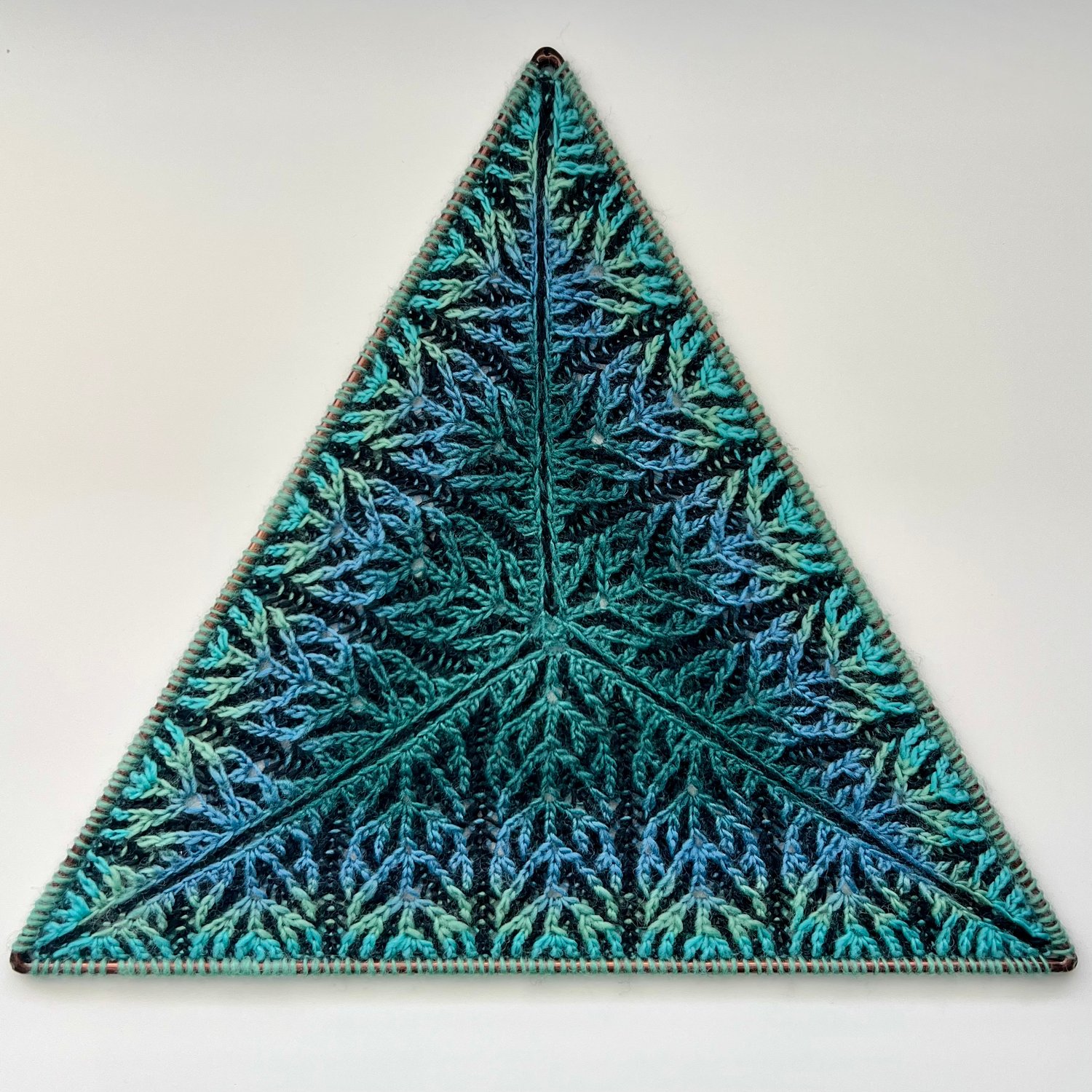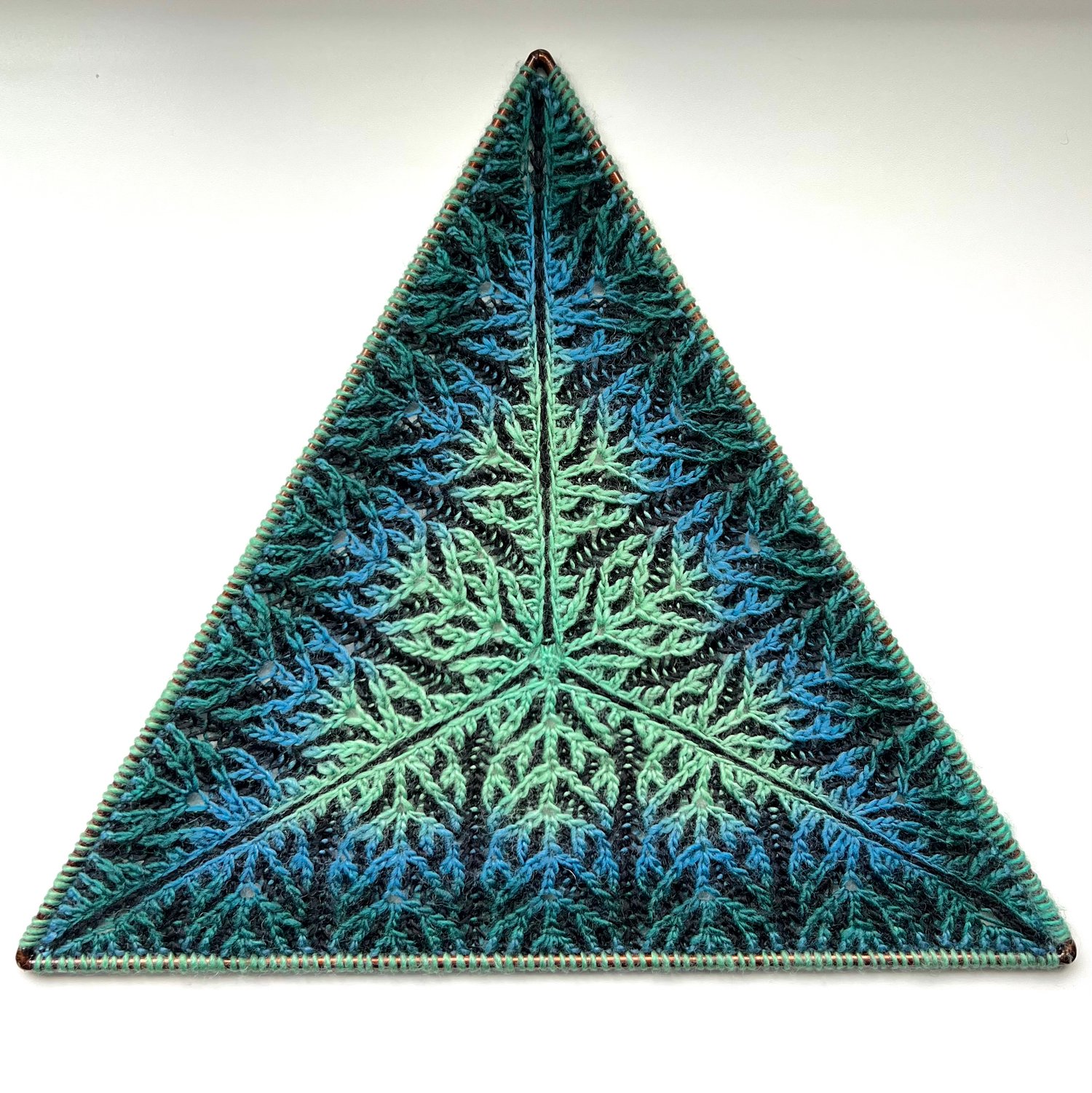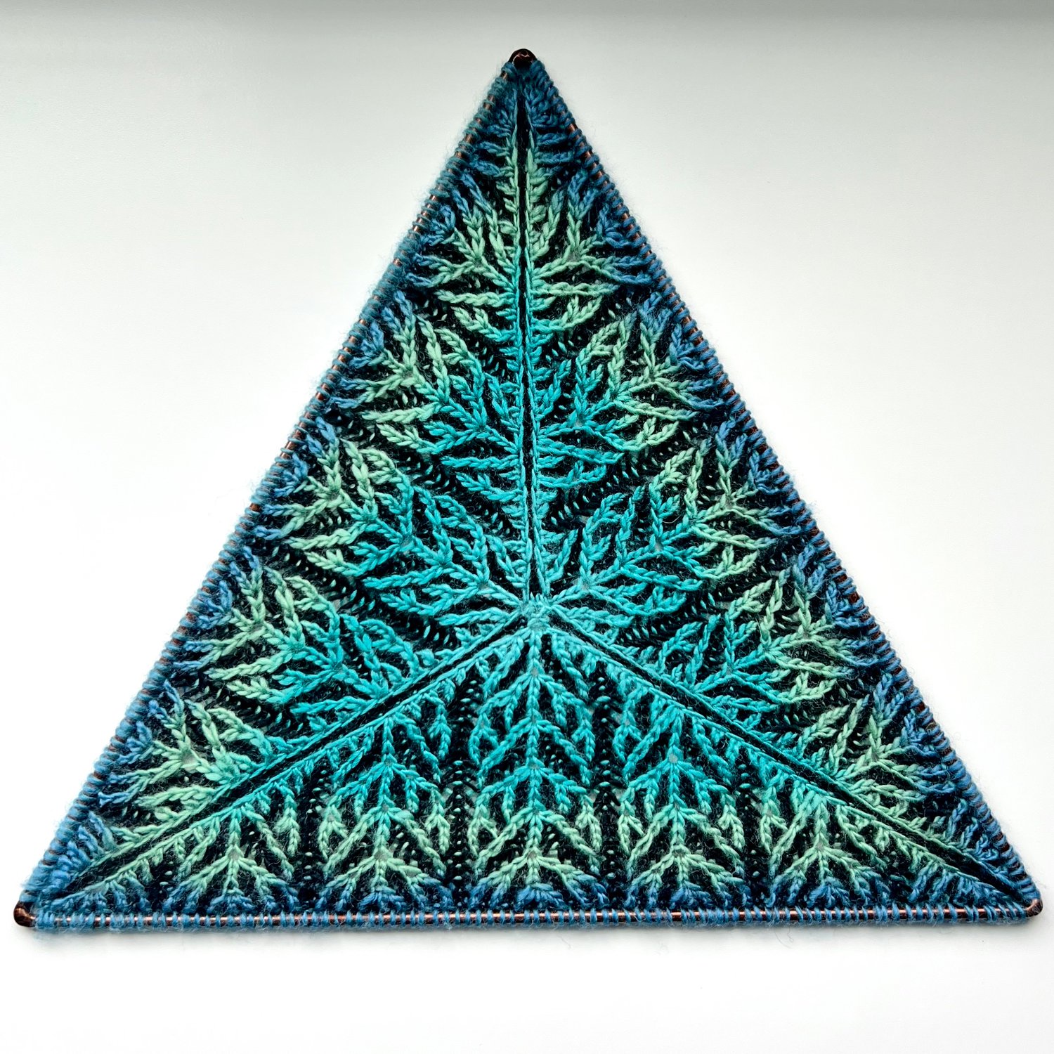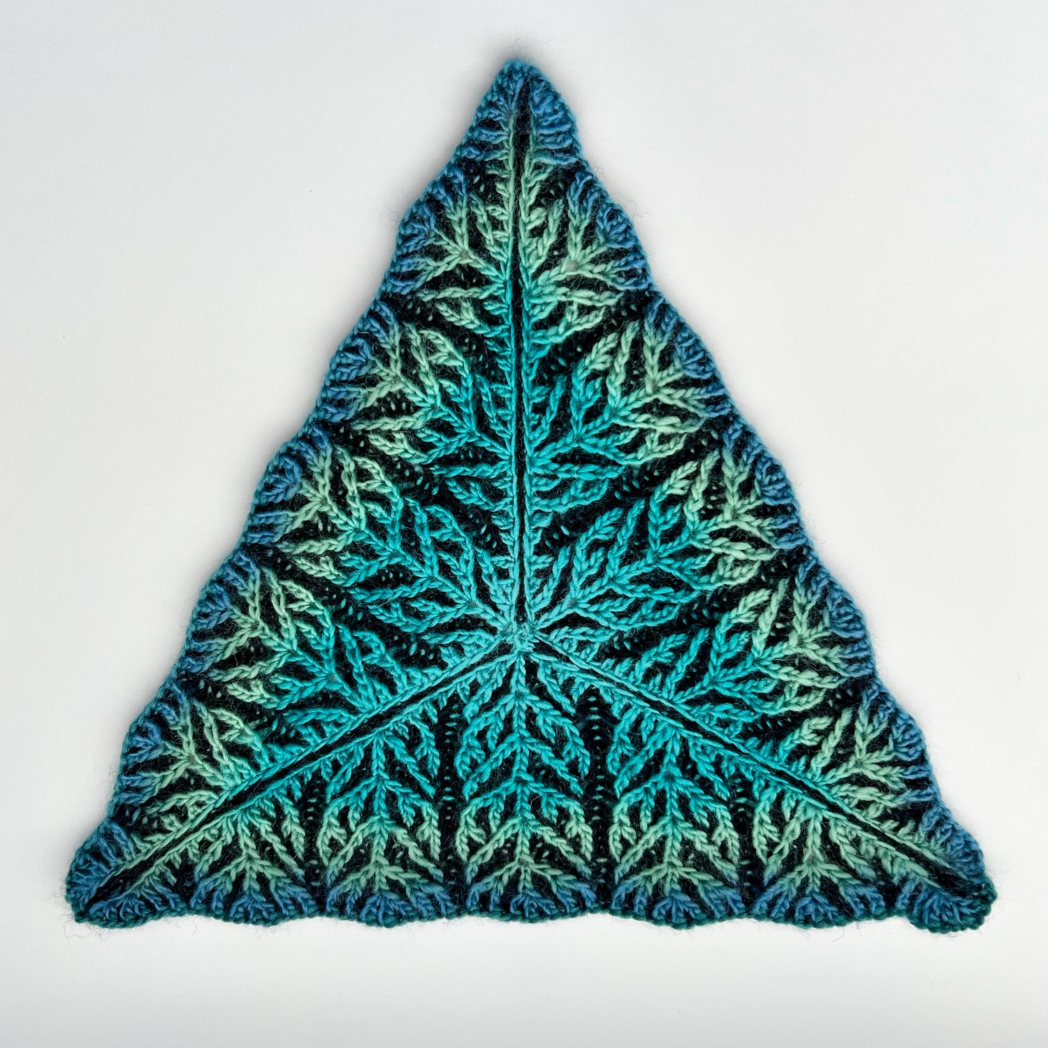 The Dendritic Triangle pattern is worked in-the-round from the center out and creates a single equilateral triangle with an original brioche stitch motif. The pattern was named for the way this motif resembles the dendritic branching of plant growth.