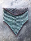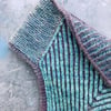 The two color Brioche pattern with garter edges is first worked from the V point flat, and then more stitches are added to form the back of the neck and joined for working in the round.