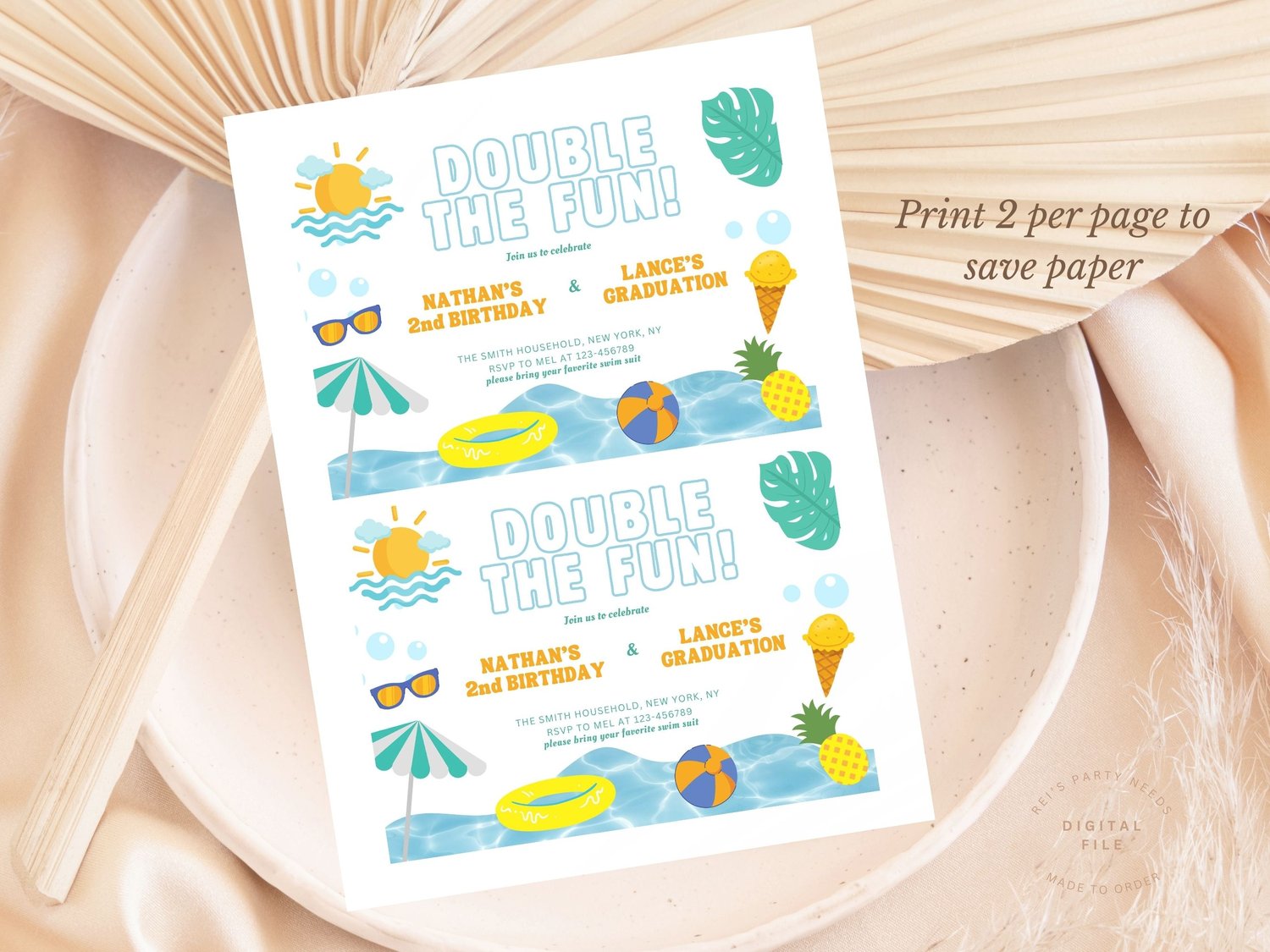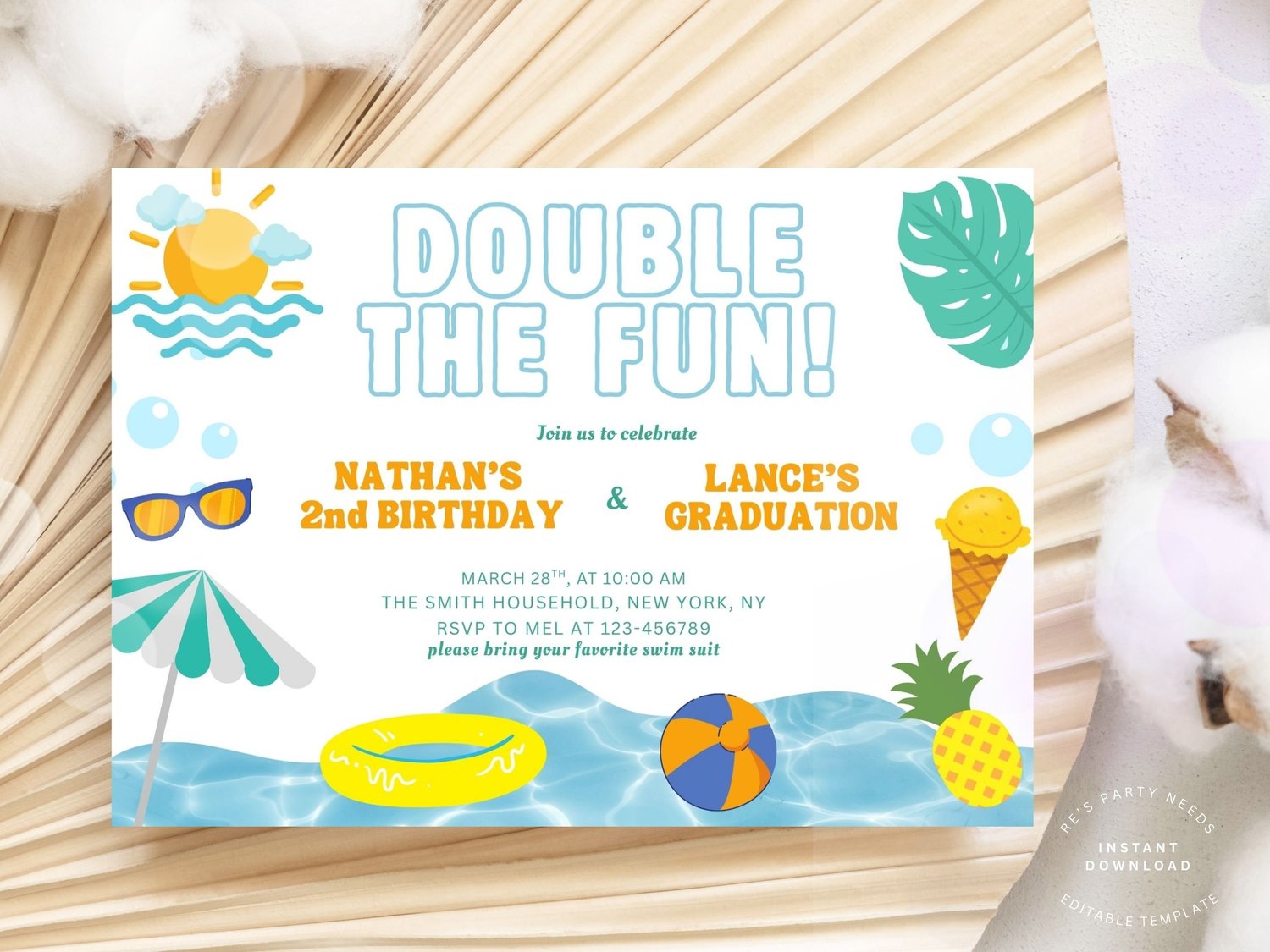 Landscaped Pool Party Joint Celebration Invitation | Summer Floats Graduation and Birthday Combined Party | Editable Canva Template | Instant Download | Digital File | Join Birthday Party invite Editable Canva Template
