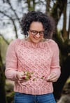 This is a cozy, warm and soft winter sweater. Designed to enhance this beautiful stitch pattern that combines lace and cables in a perfect way. It has a boat neck and relaxed, slightly oversized, fit. Plus is worked on a super-fast combination of aran weight + 6 mm needles and in a super soft and light organic yarn.