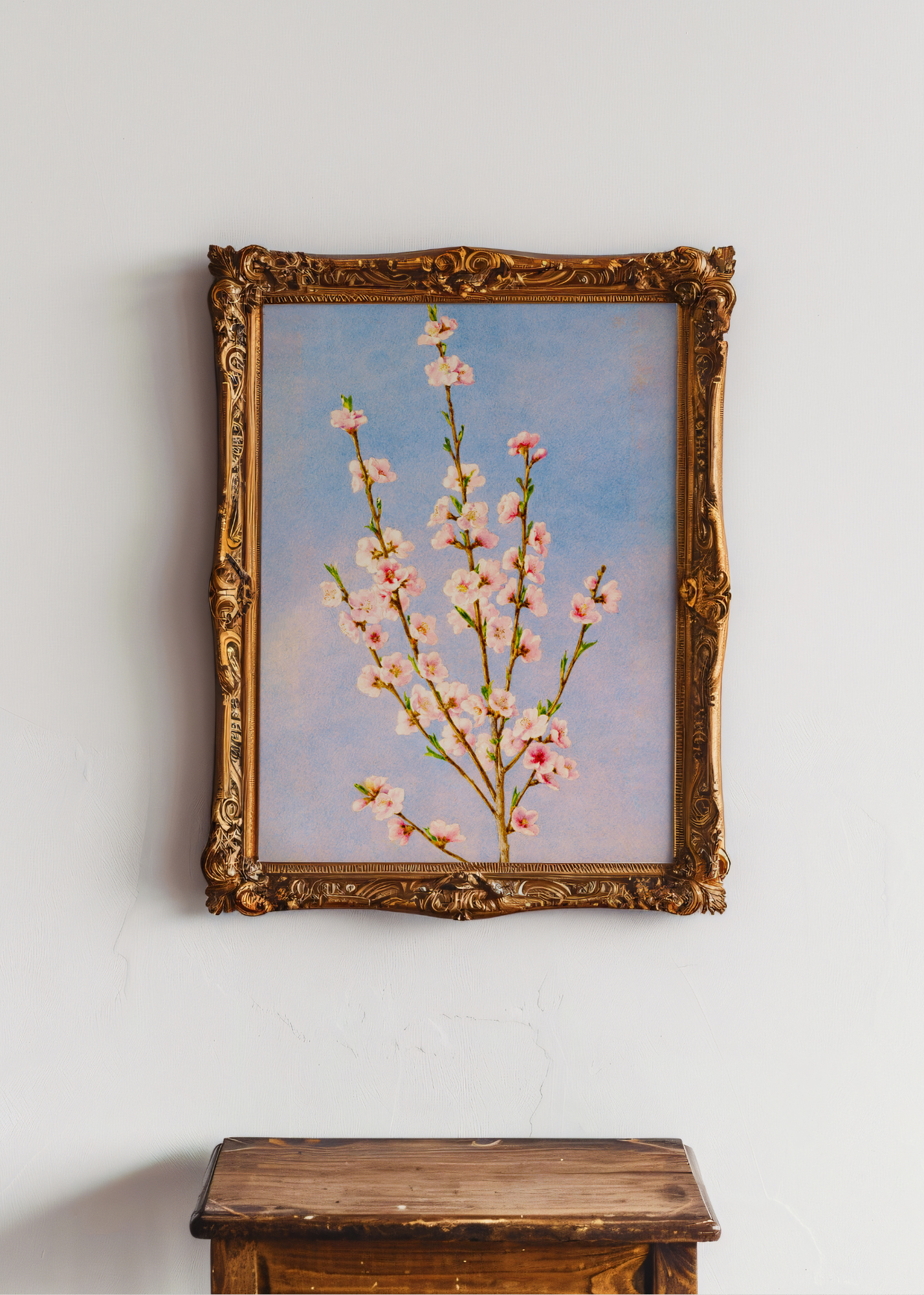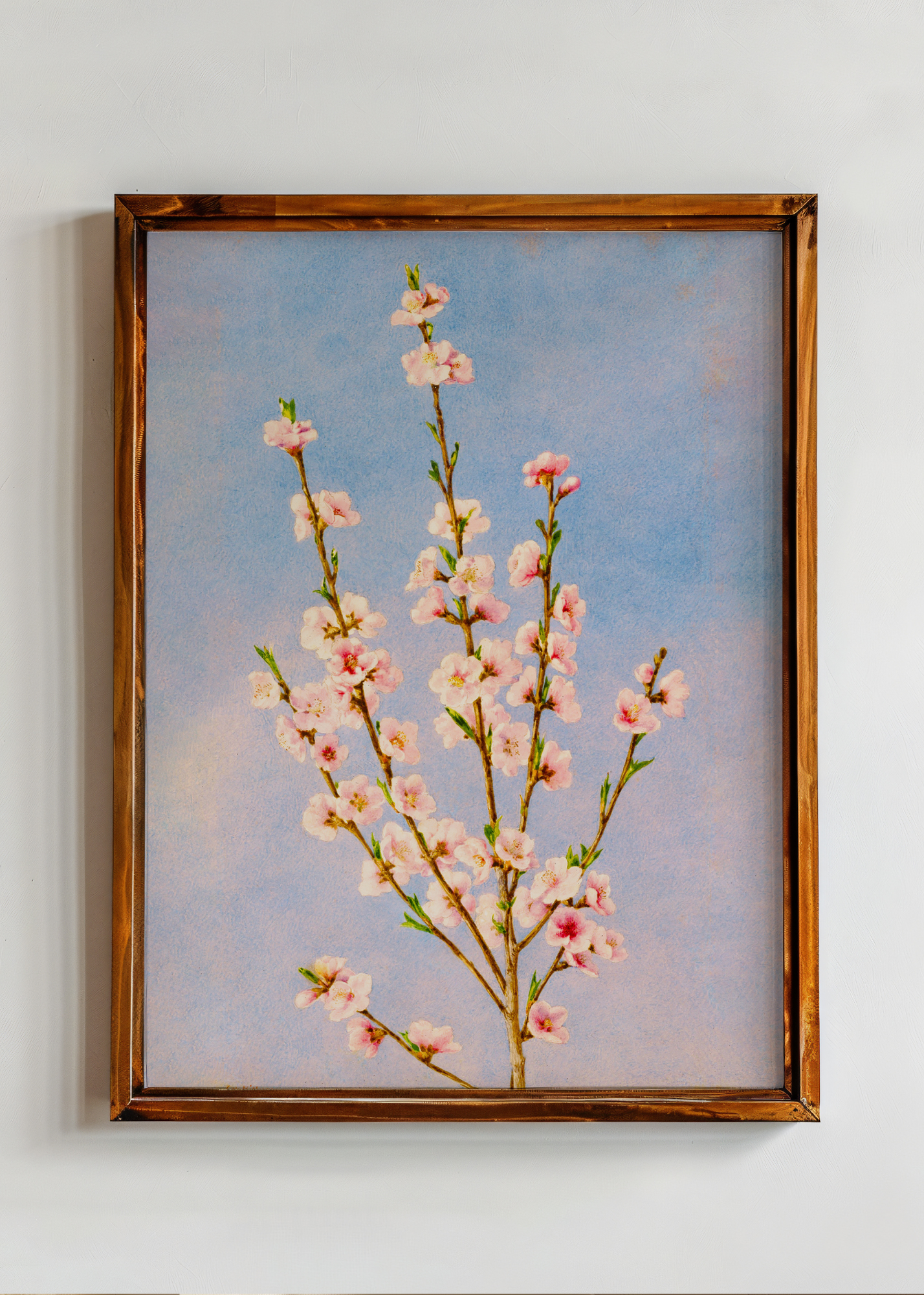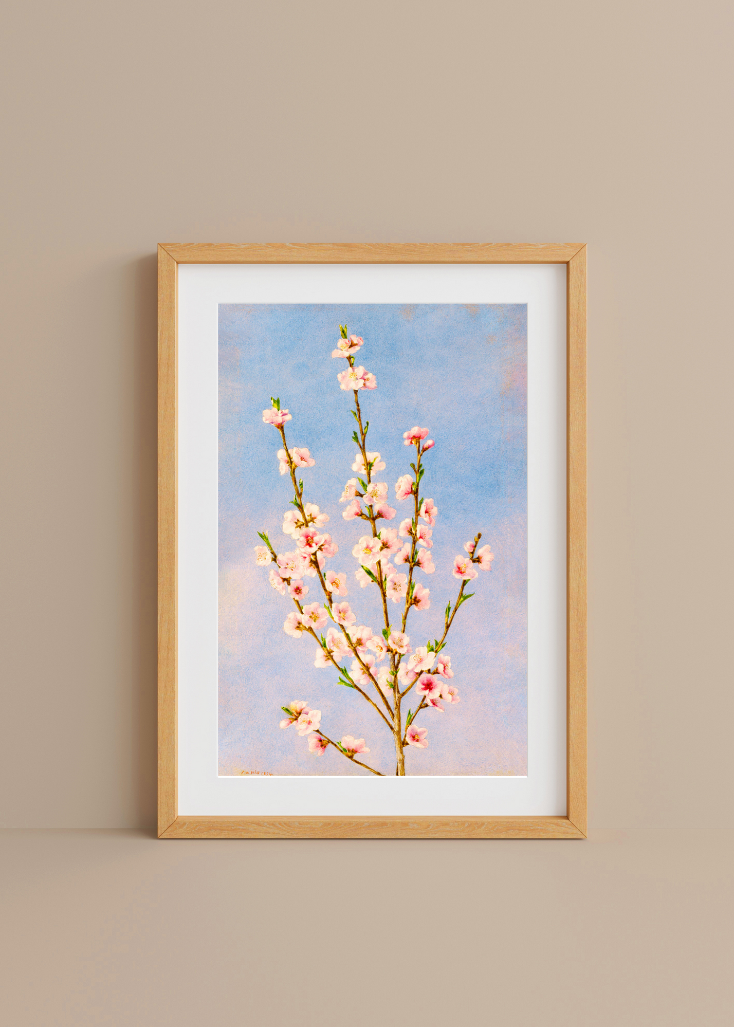 Peach Blossoms— With the lightest touch of brush and breath, Peach Blossoms by John William Hill captures spring in its first exhale—a moment of fragile bloom suspended in time. Each petal, tinged with the palest blush, feels as if it might tremble under the weight of dew. The branches twist gently skyward, slender and spare, their buds unfurling with quiet courage.