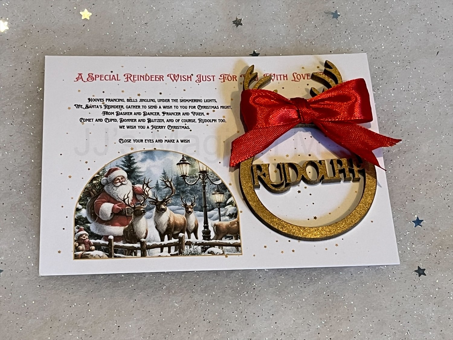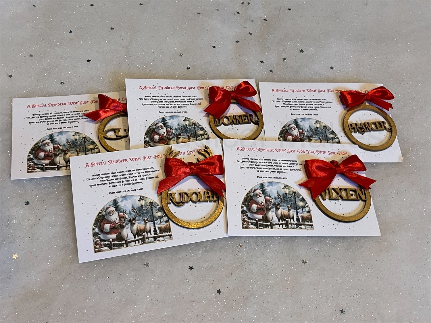A special reindeer wish gift from your favourite reindeer. 9 Variations. Dasher, Dancer, Prancer, Vixen, Comet, Cupid, Donner, Blitzen and Rudolph. If the reindeer you want is out of stock please message direct. A6 in size with wooden decoration attached.