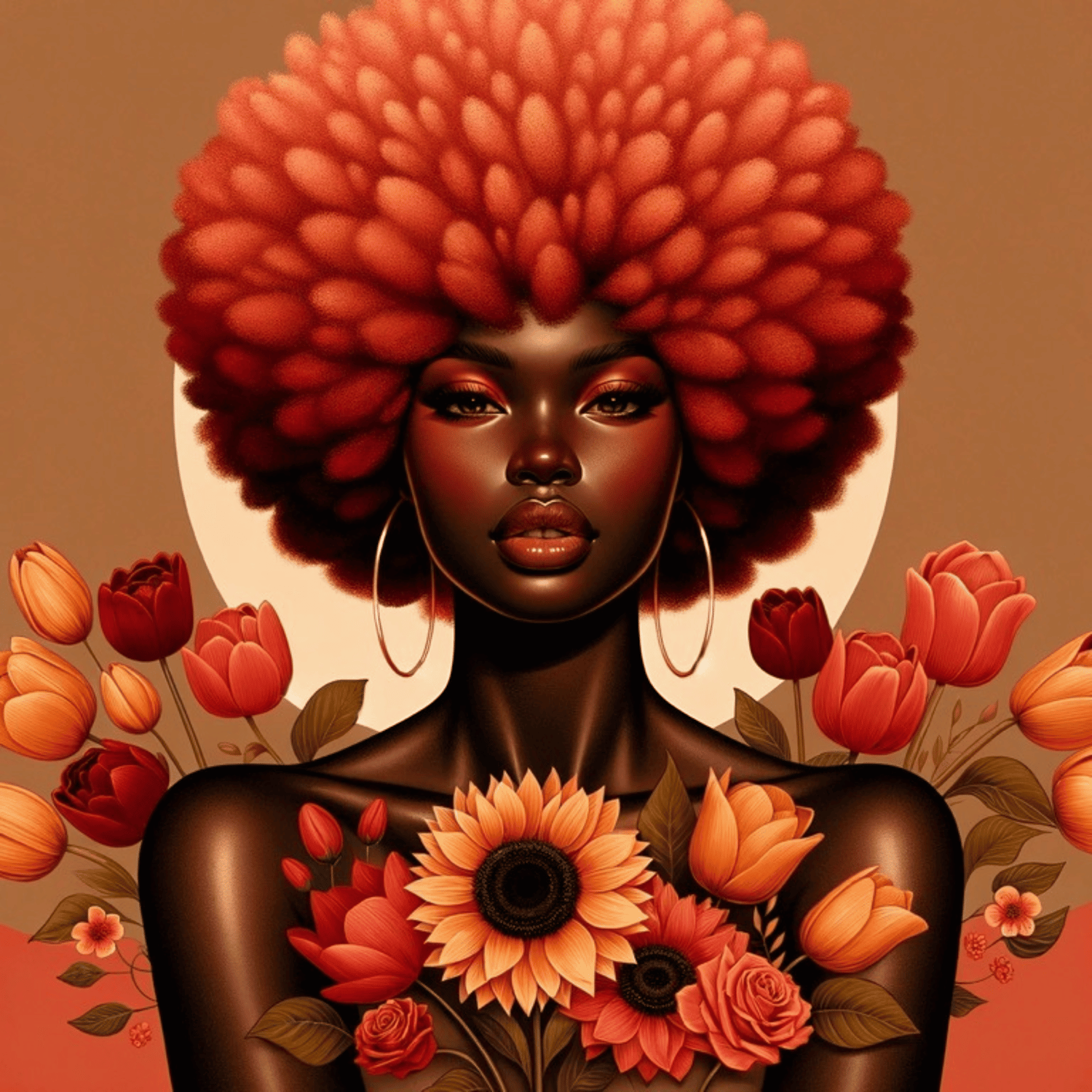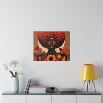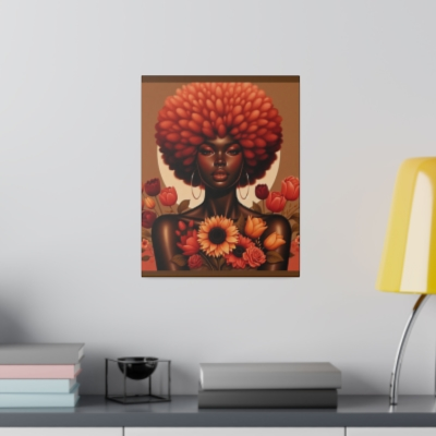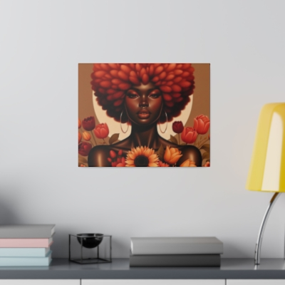 Our Canvas Wall Art is a symphony of visual elegance for your living space. This collection features a stunning wall art canvas that captures the essence of empowerment and beauty through a striking image of a woman with a vibrant afro as a symbol of natural grace, surrounded by a lush bouquet of tulips and sunflowers. Her warm, chocolate complexion harmonizes with the rich floral tapestry, creating an atmosphere of sophistication and warmth.